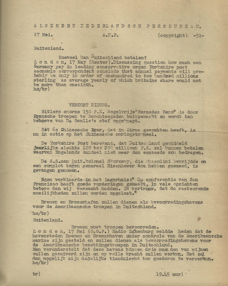 Algemeen Nederlandsch Persbureau, mededelingen, 17 m...