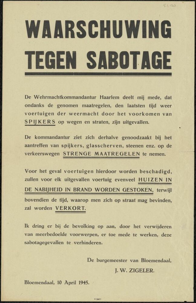 poster; Waarschuwing tegen sabotage te Bloemendaal, ...