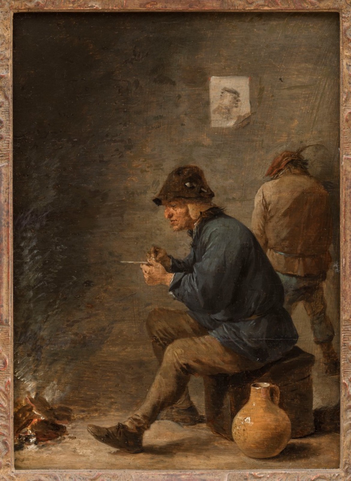 Interieur met een man die zijn pijp stopt
