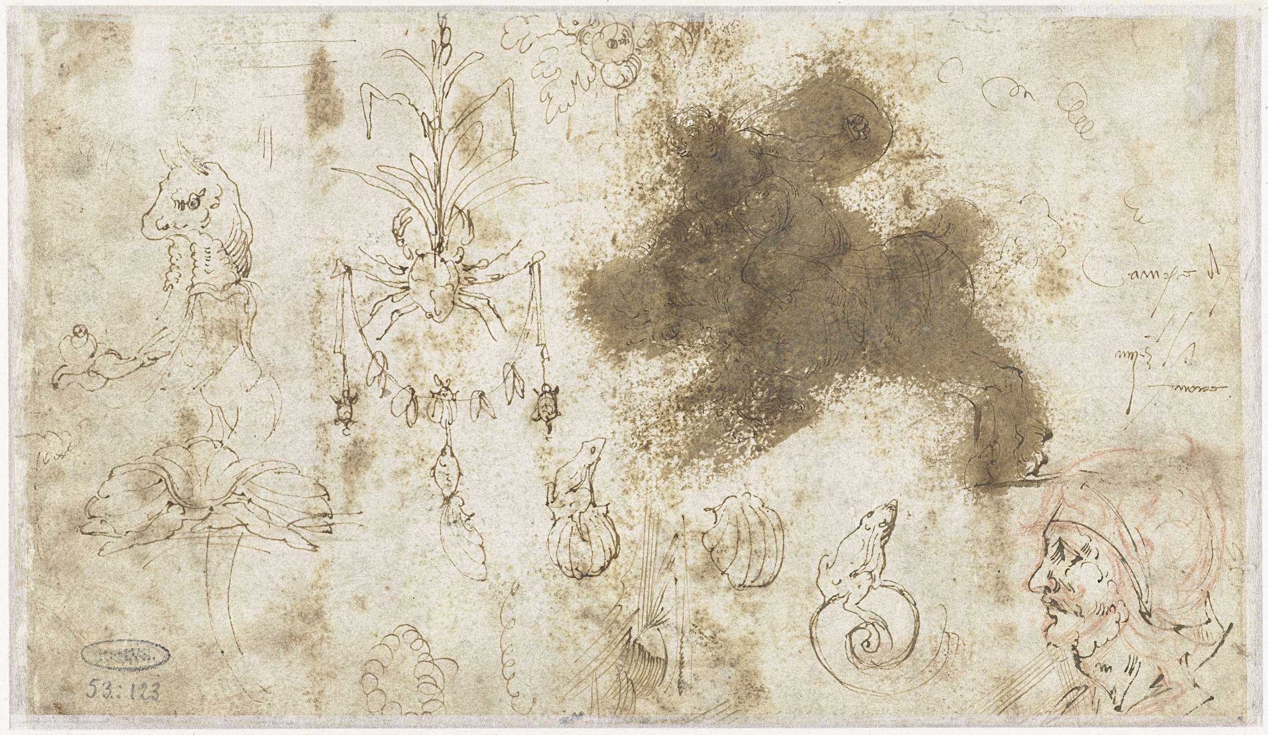 Ornamenten, een manskop en dieren