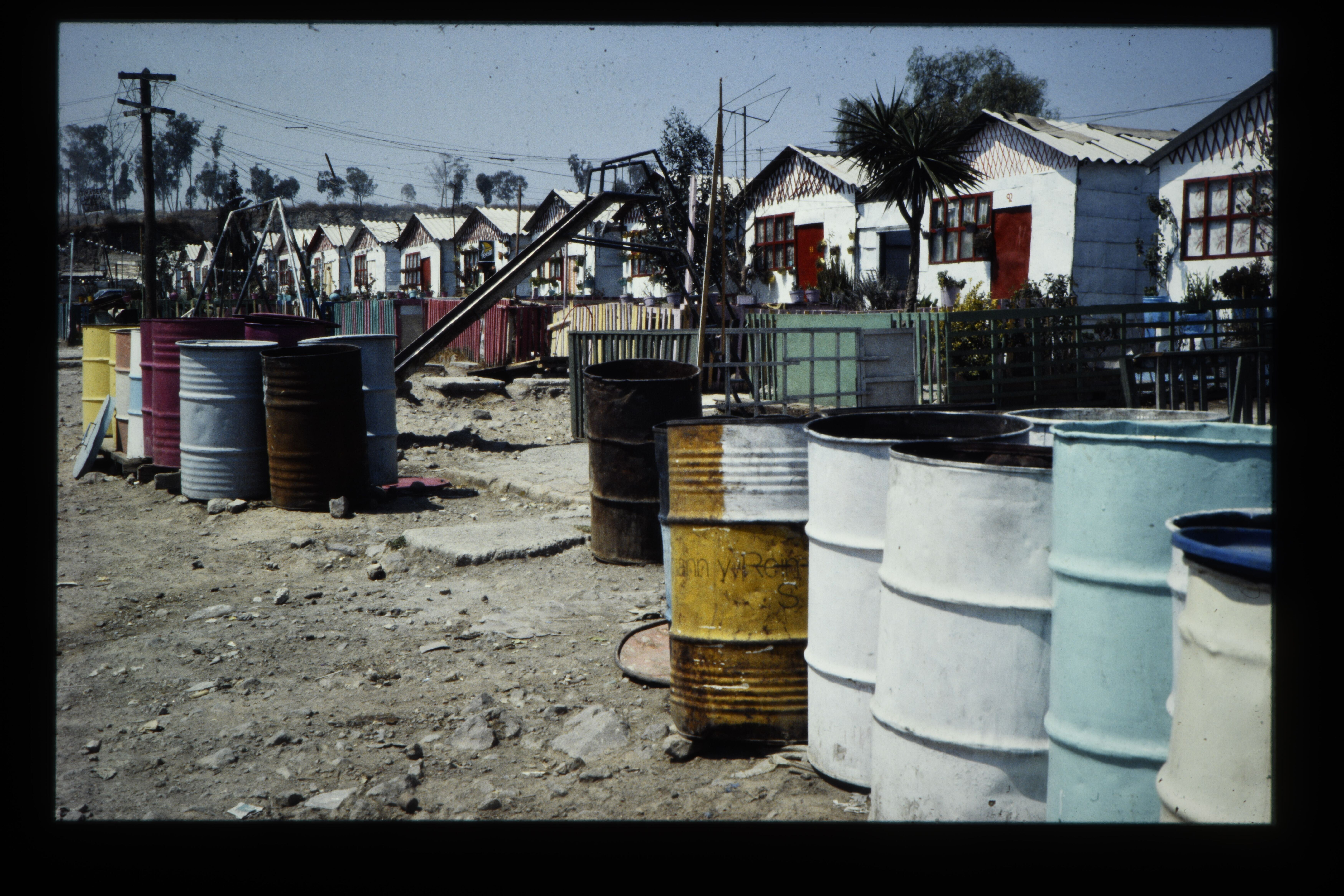 'Straatje van uit olievaten bestaande huisjes.'