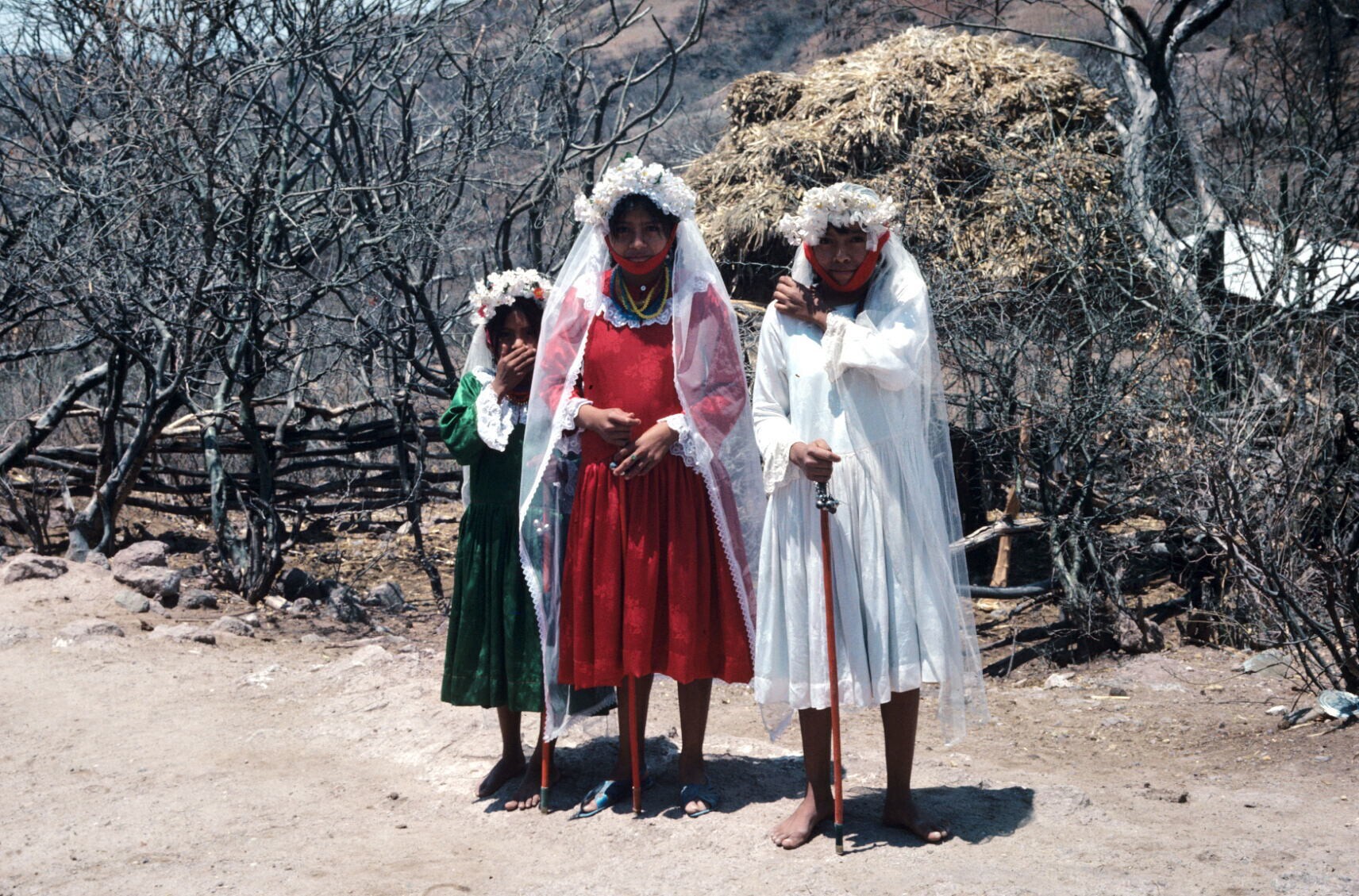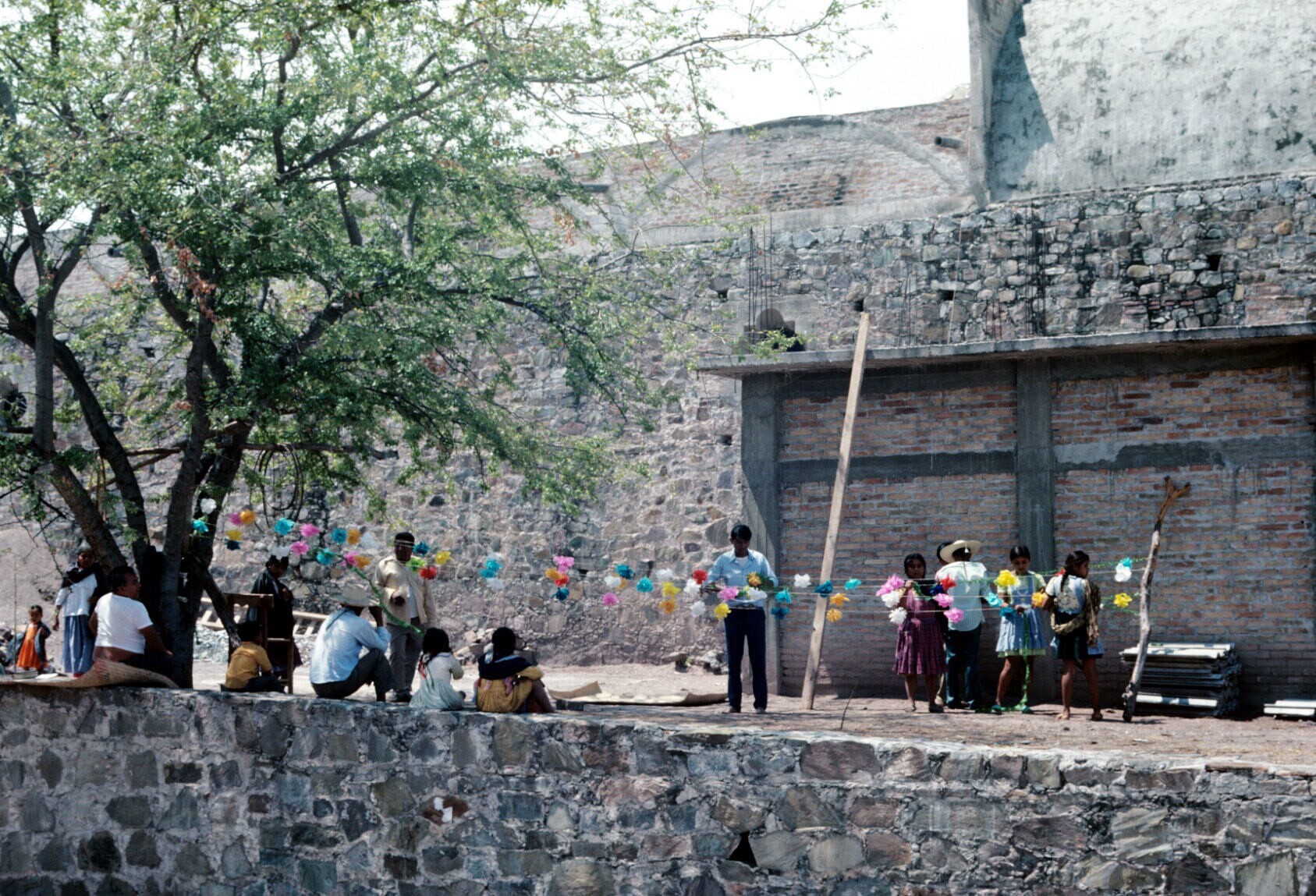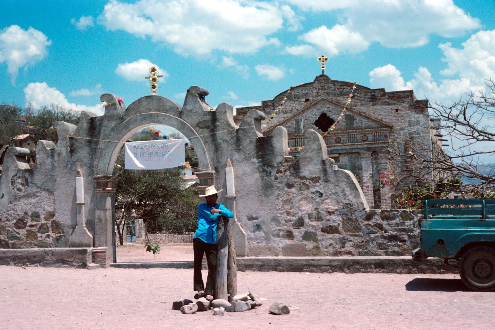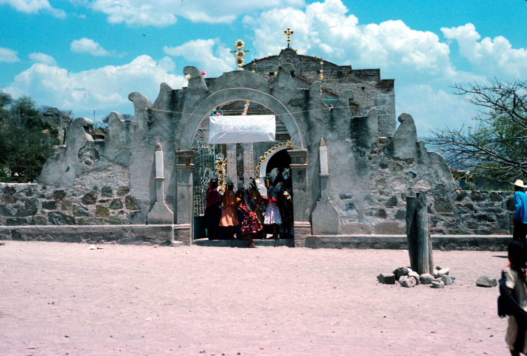 versieringen bij kerk; op voorgrond: Angel Juárez