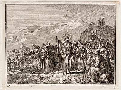 Jezus, gevolgd door een grote menigte, predikt in de...