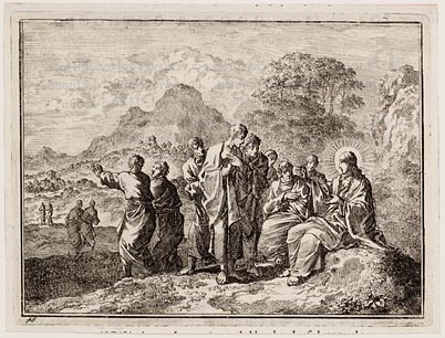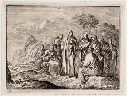 Jezus omringd door zijn discipelen stelt hun een kin...