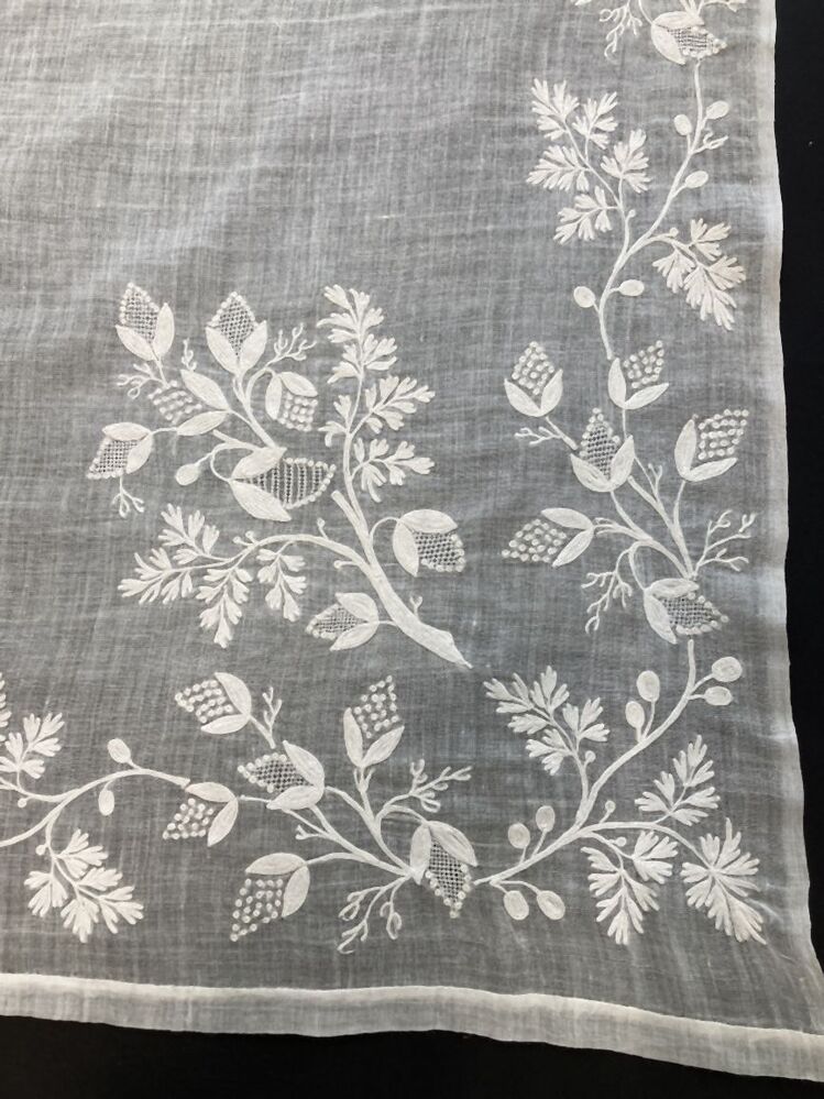 Schort van tule waarop met bladmotief doorgestopte r...
