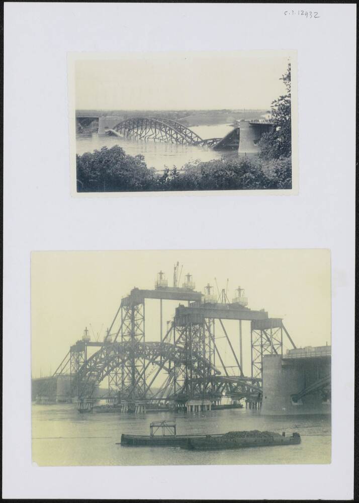 Twee foto's: een van de opgeblazen Waalbrug en een v...