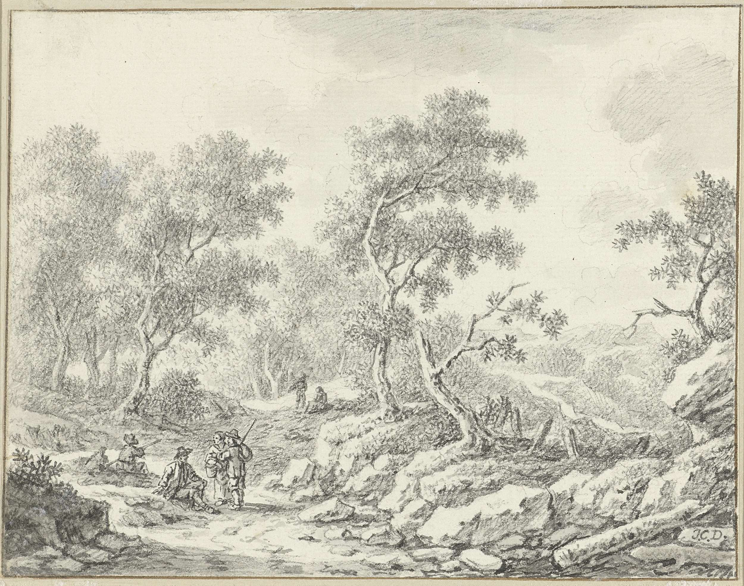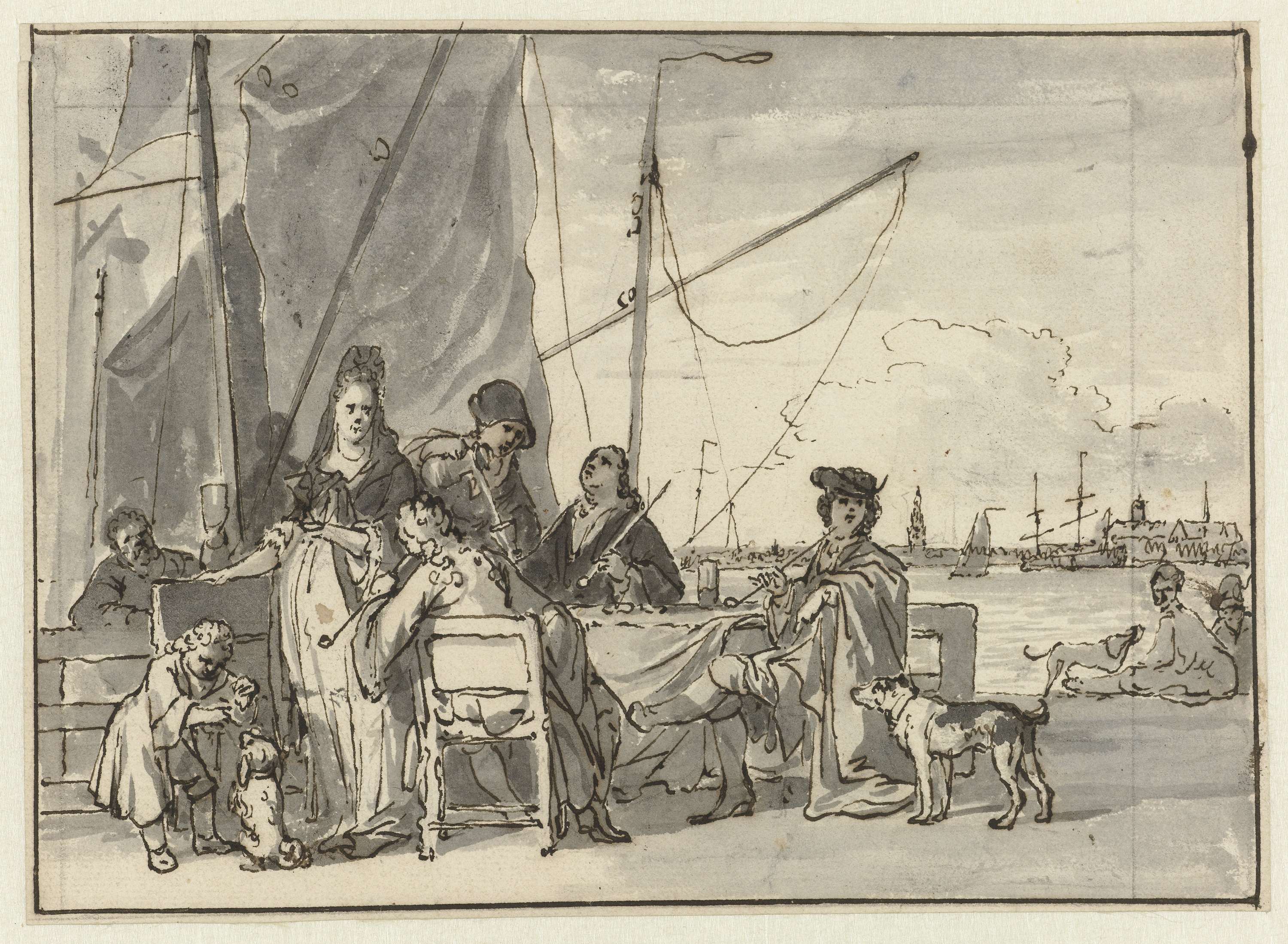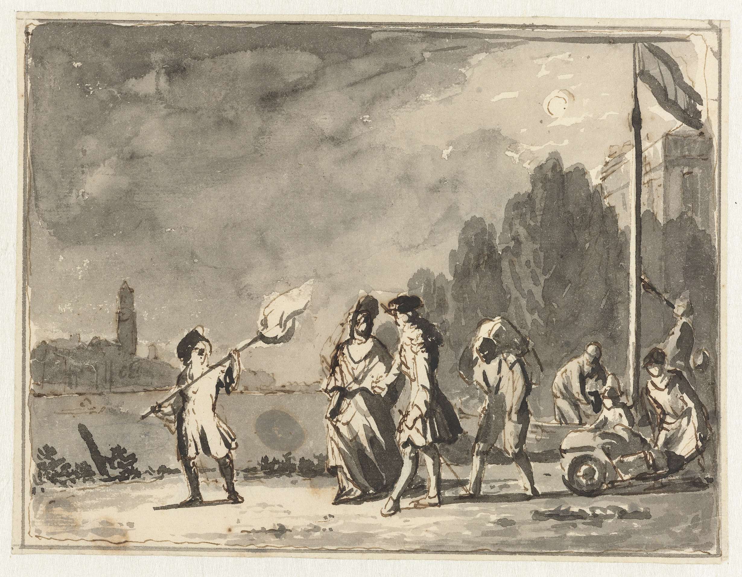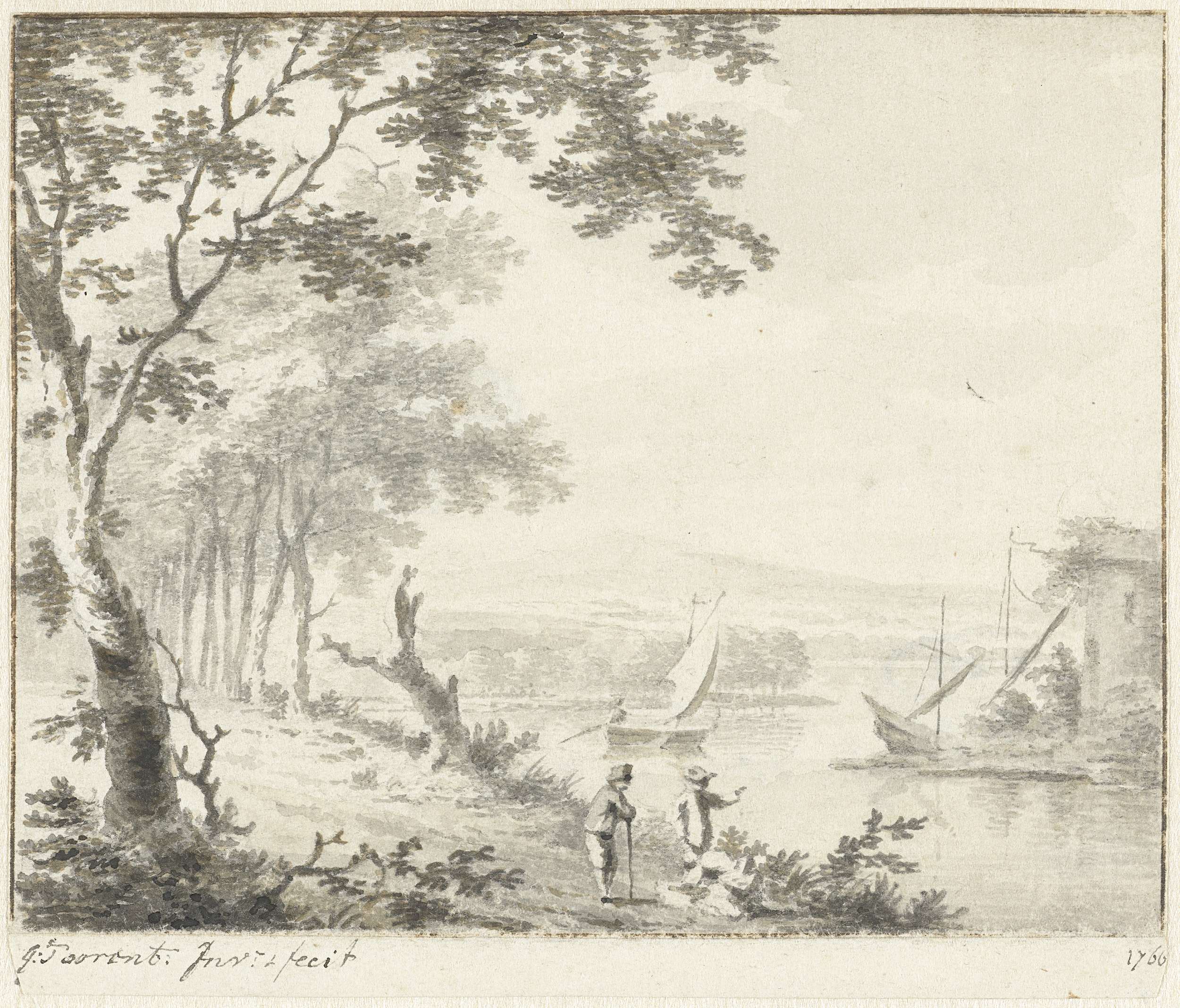 Rivierlandschap met vissers, viskorven en zeilschepen