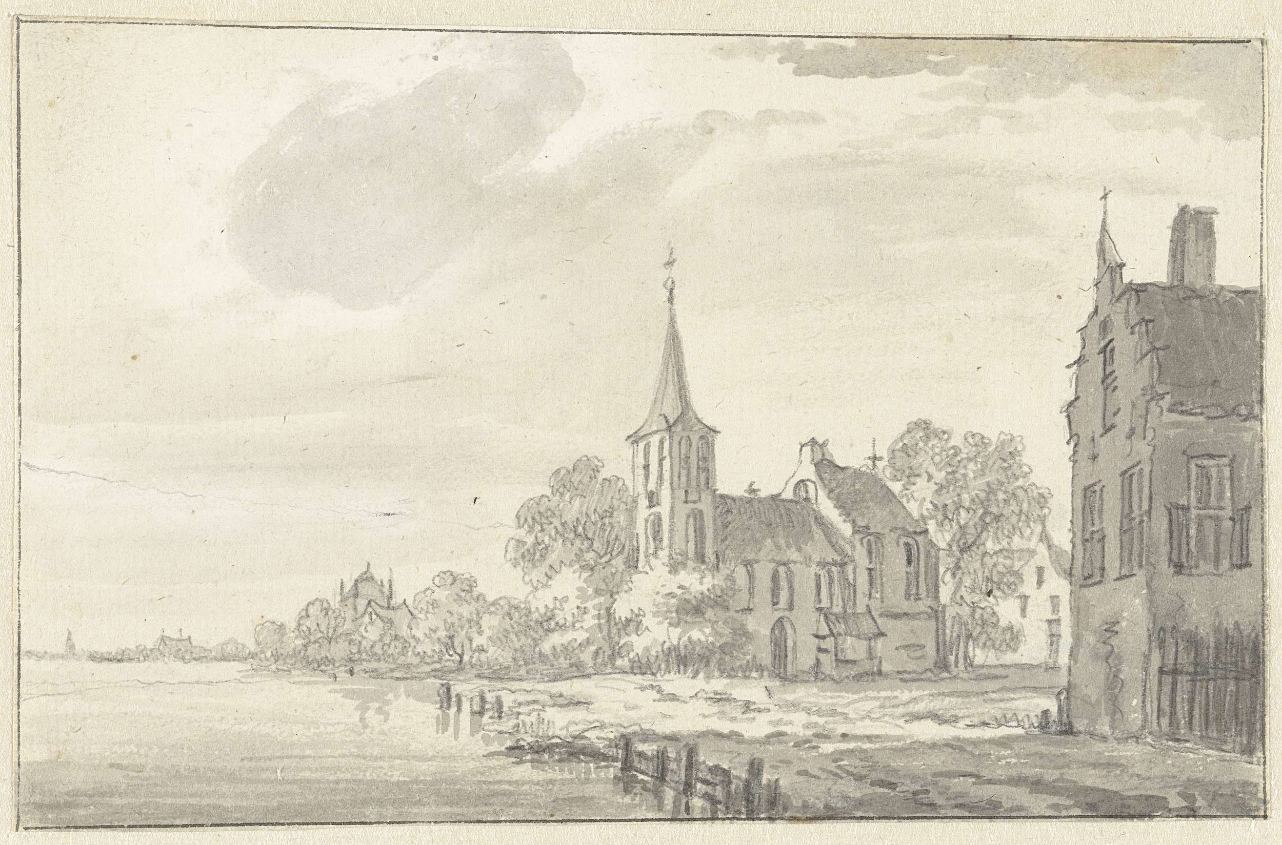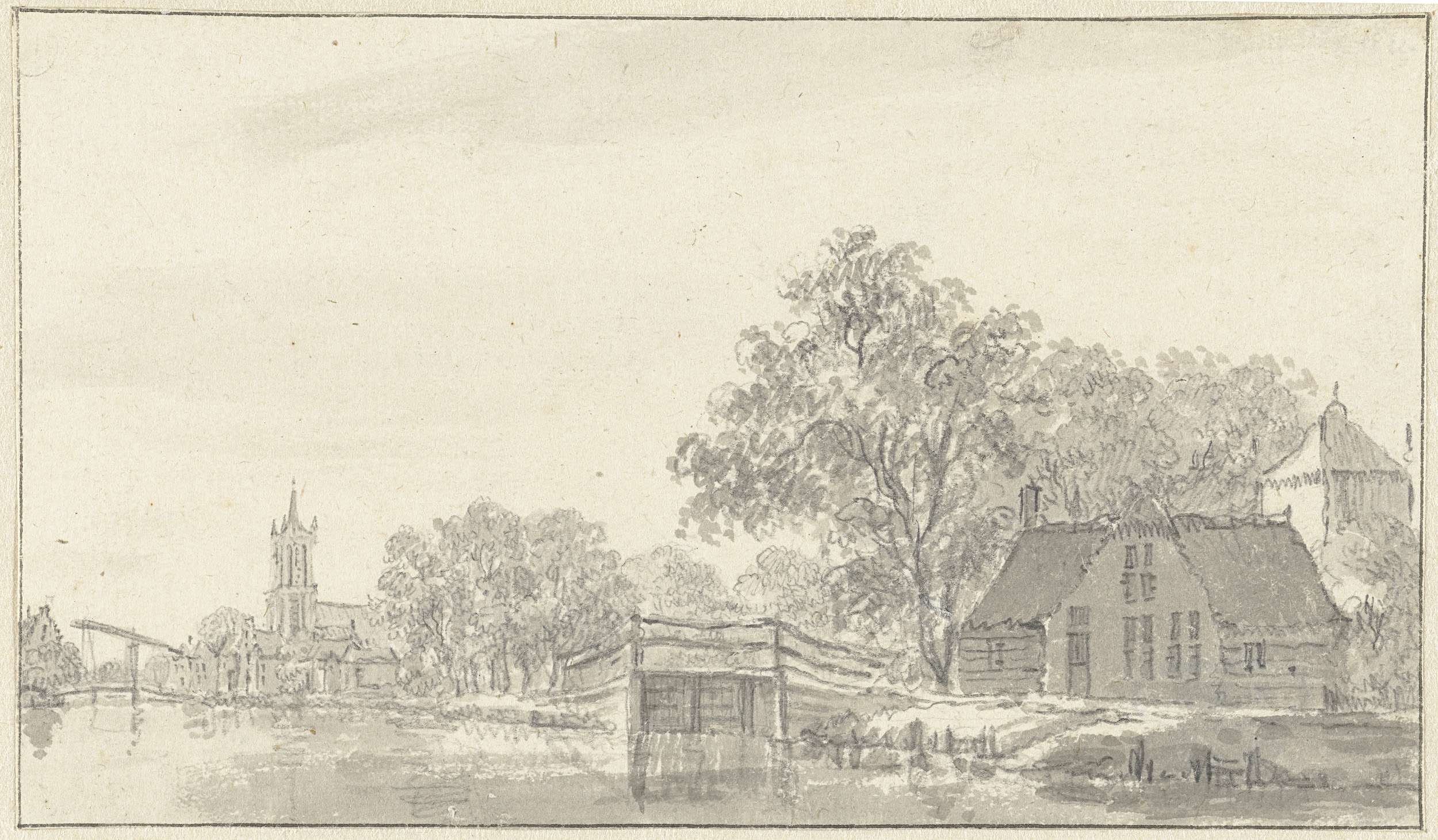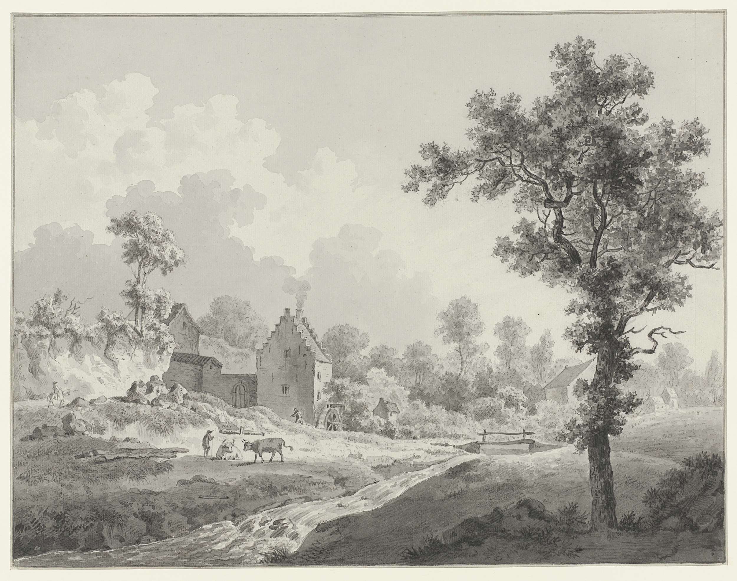 Rivierlandschap met een sluisje, een brug en enkele ...