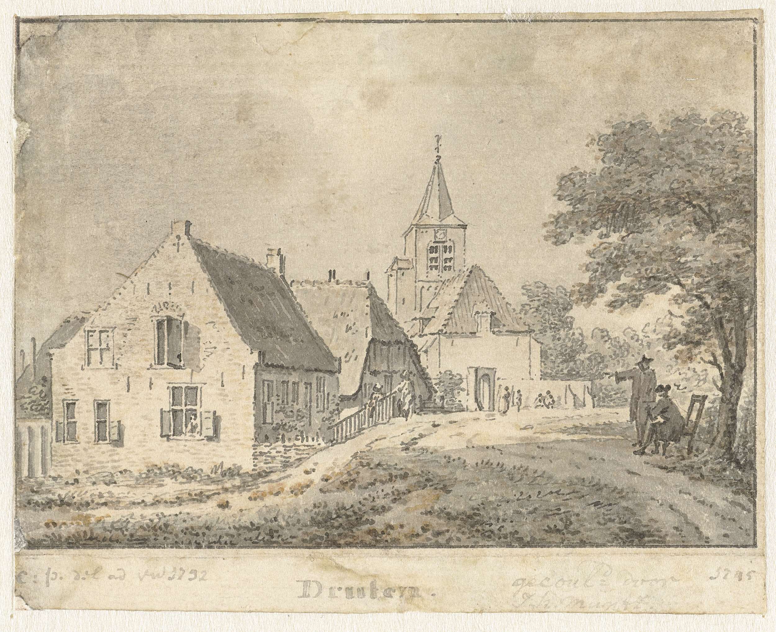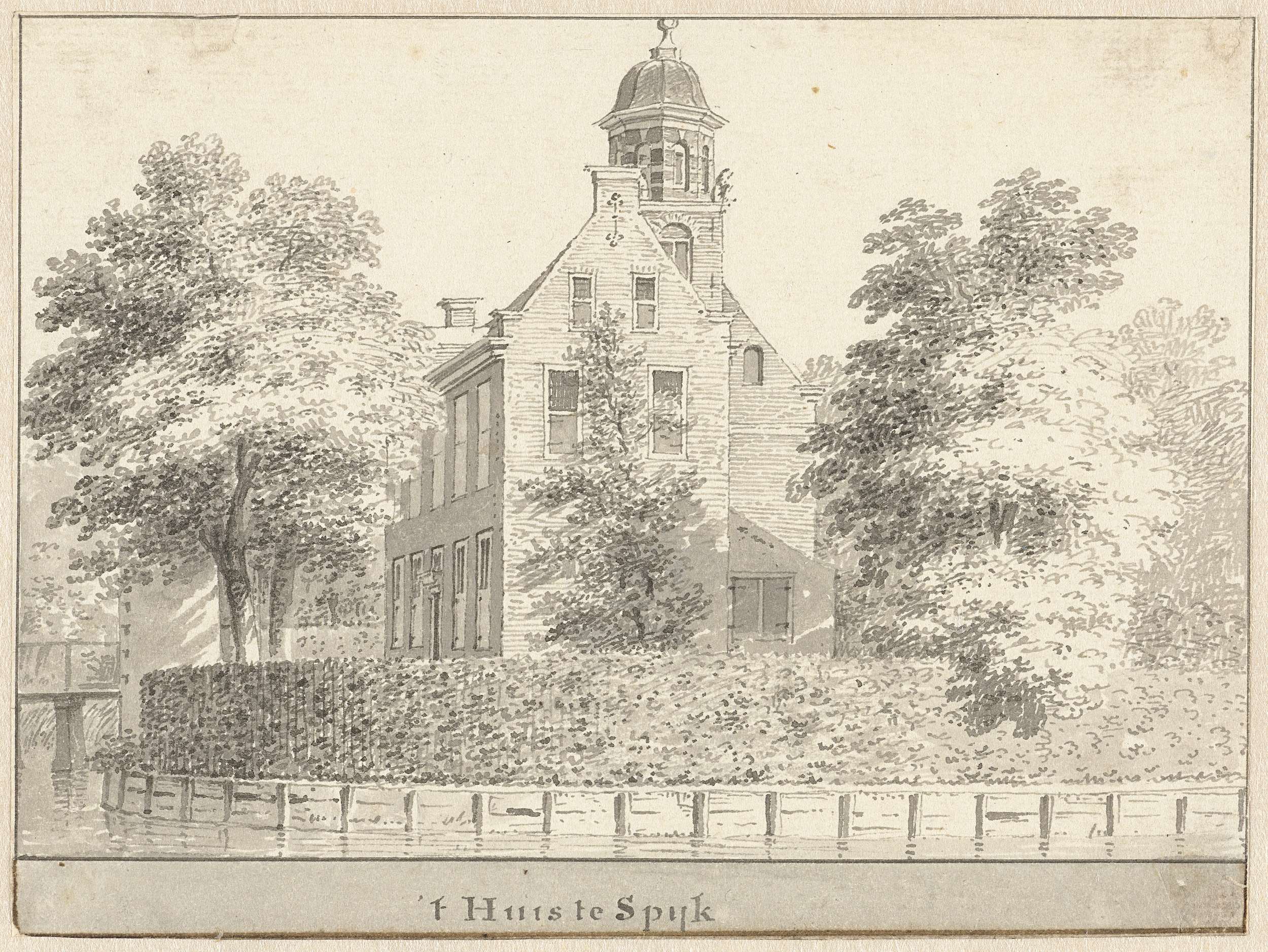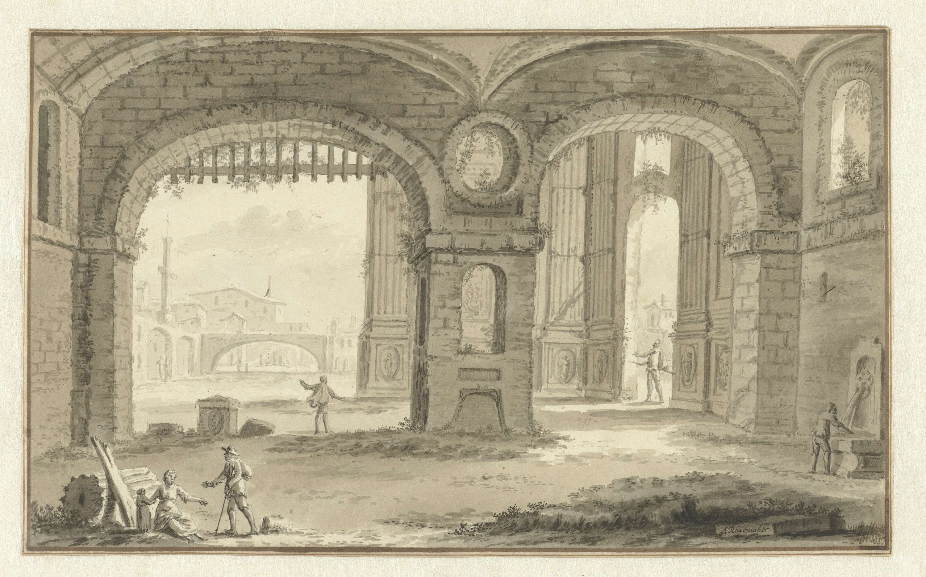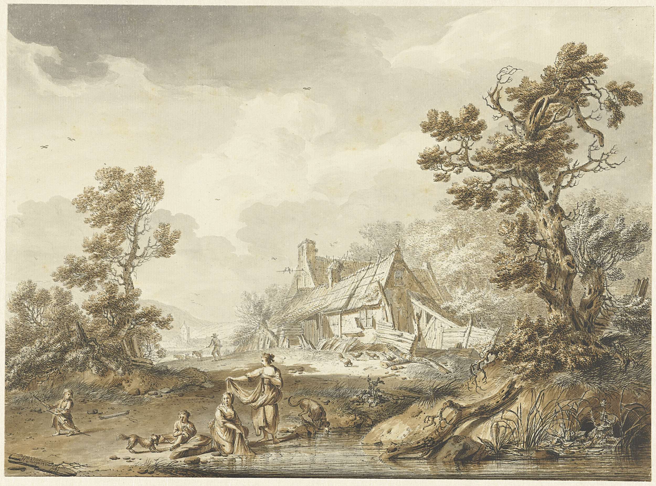 Rivierlandschap met een sluisje, een brug en enkele ...