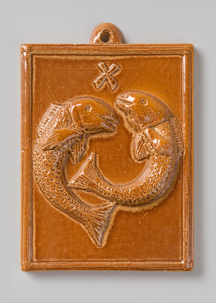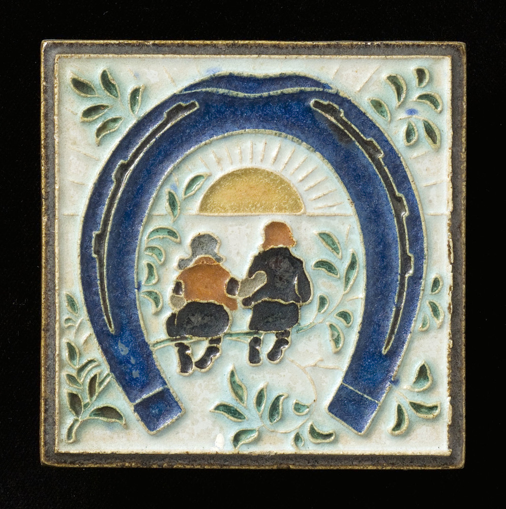 Tegel in, cloisonné-techniek, voorstellende zgn hoef...