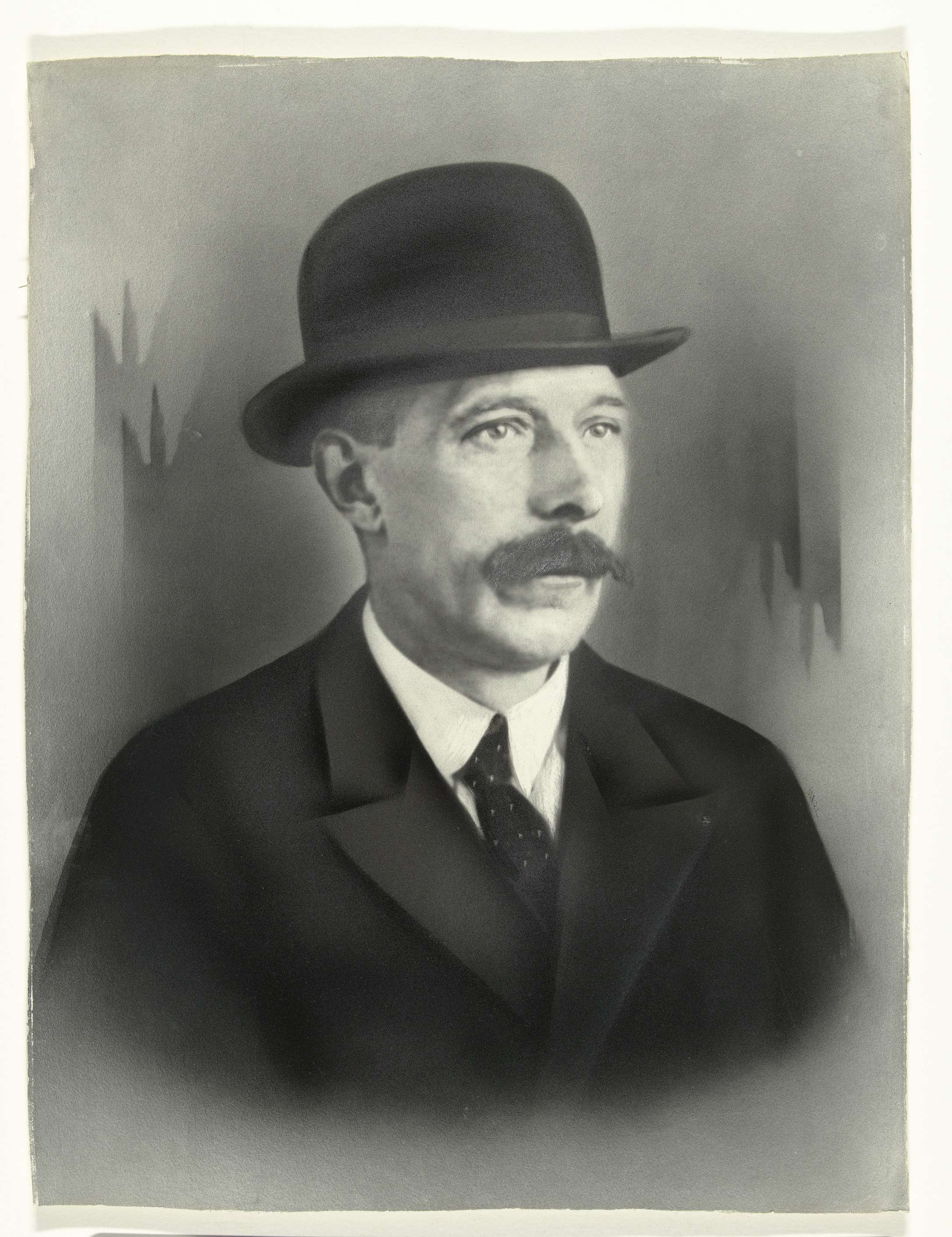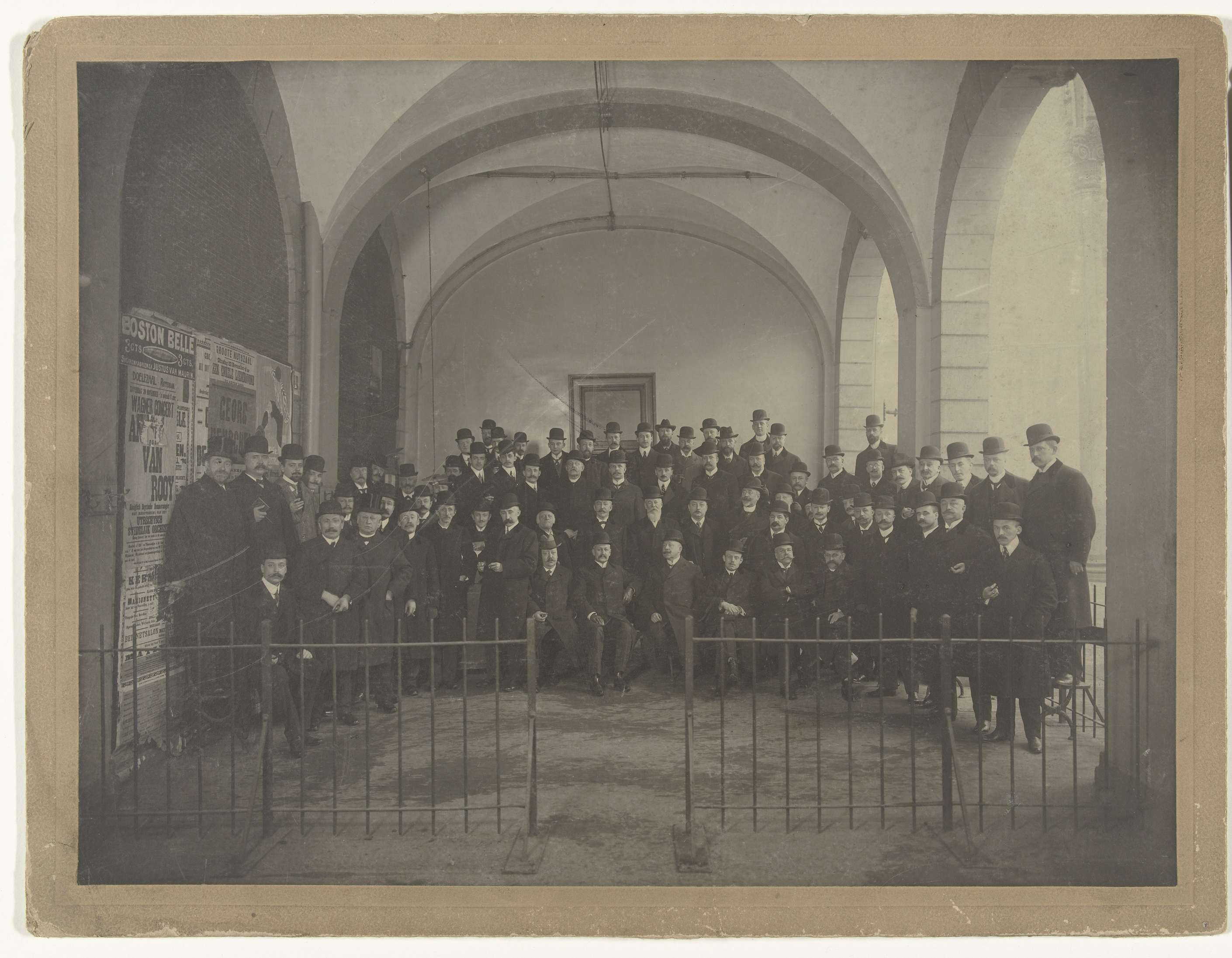 Groepsportret van mannen met bolhoeden in de voorhal...