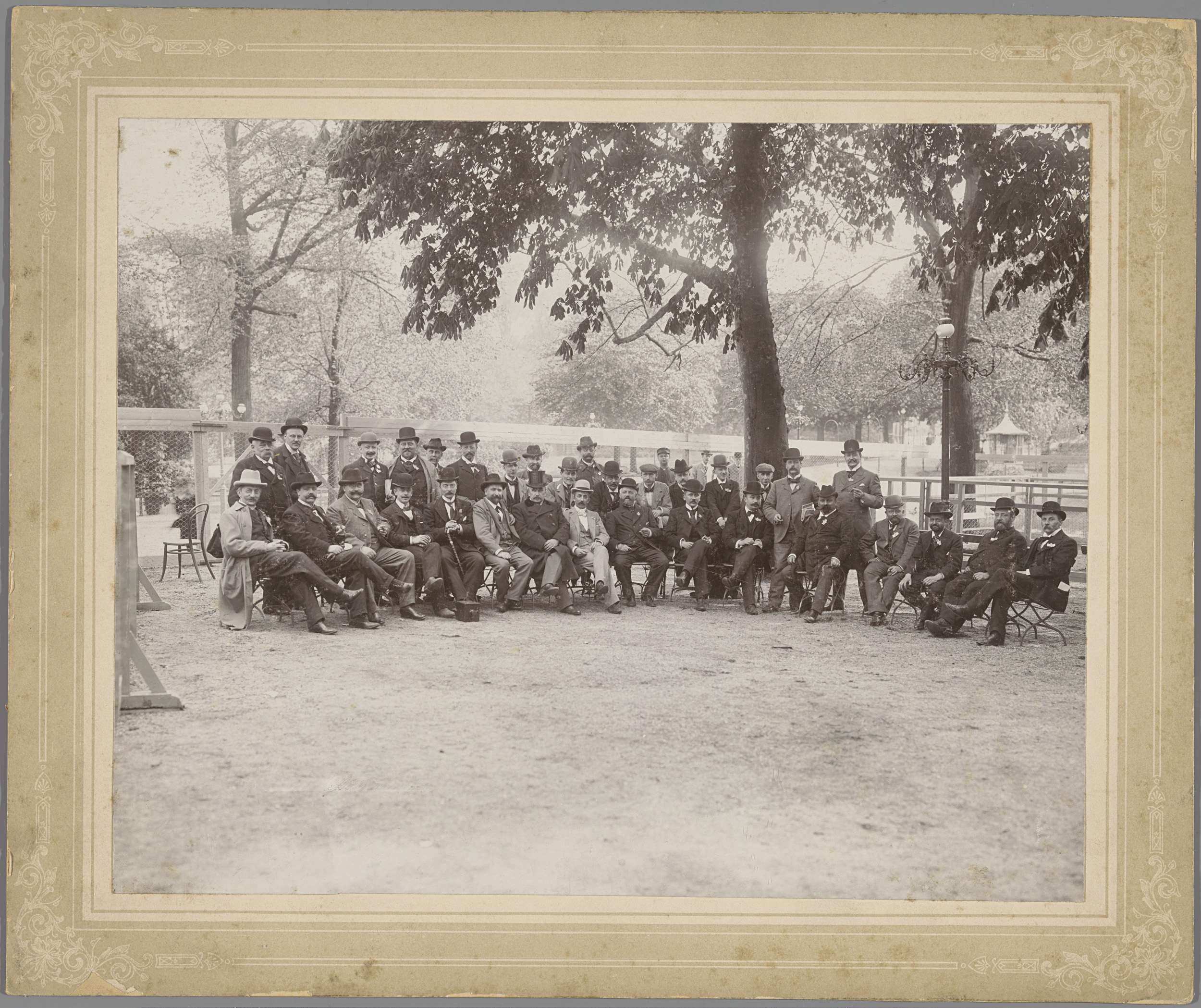 Groepsportret van mannen met bolhoeden op tuinstoelen