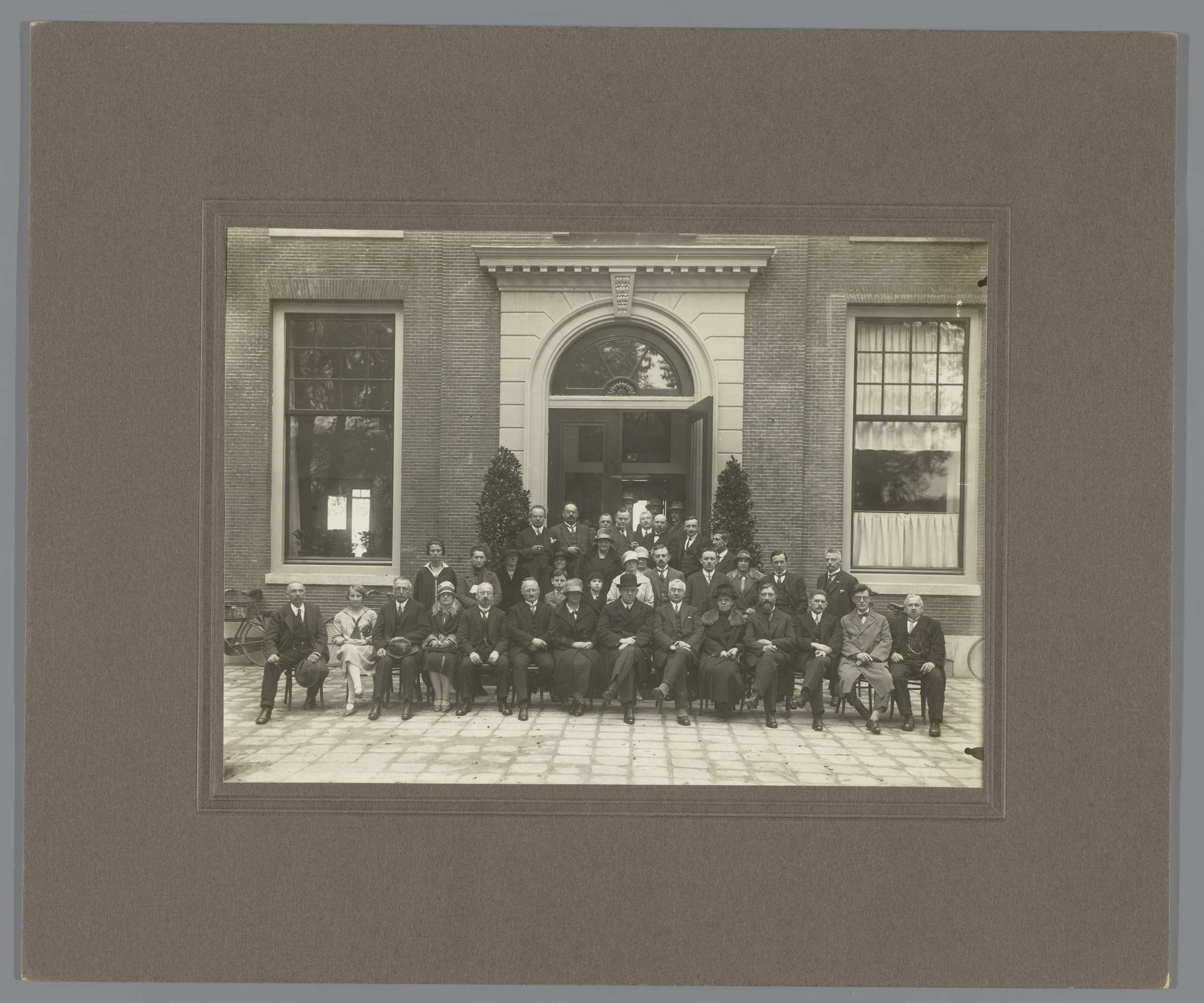 Groepsportret van mannen en vrouwen voor de ingang v...