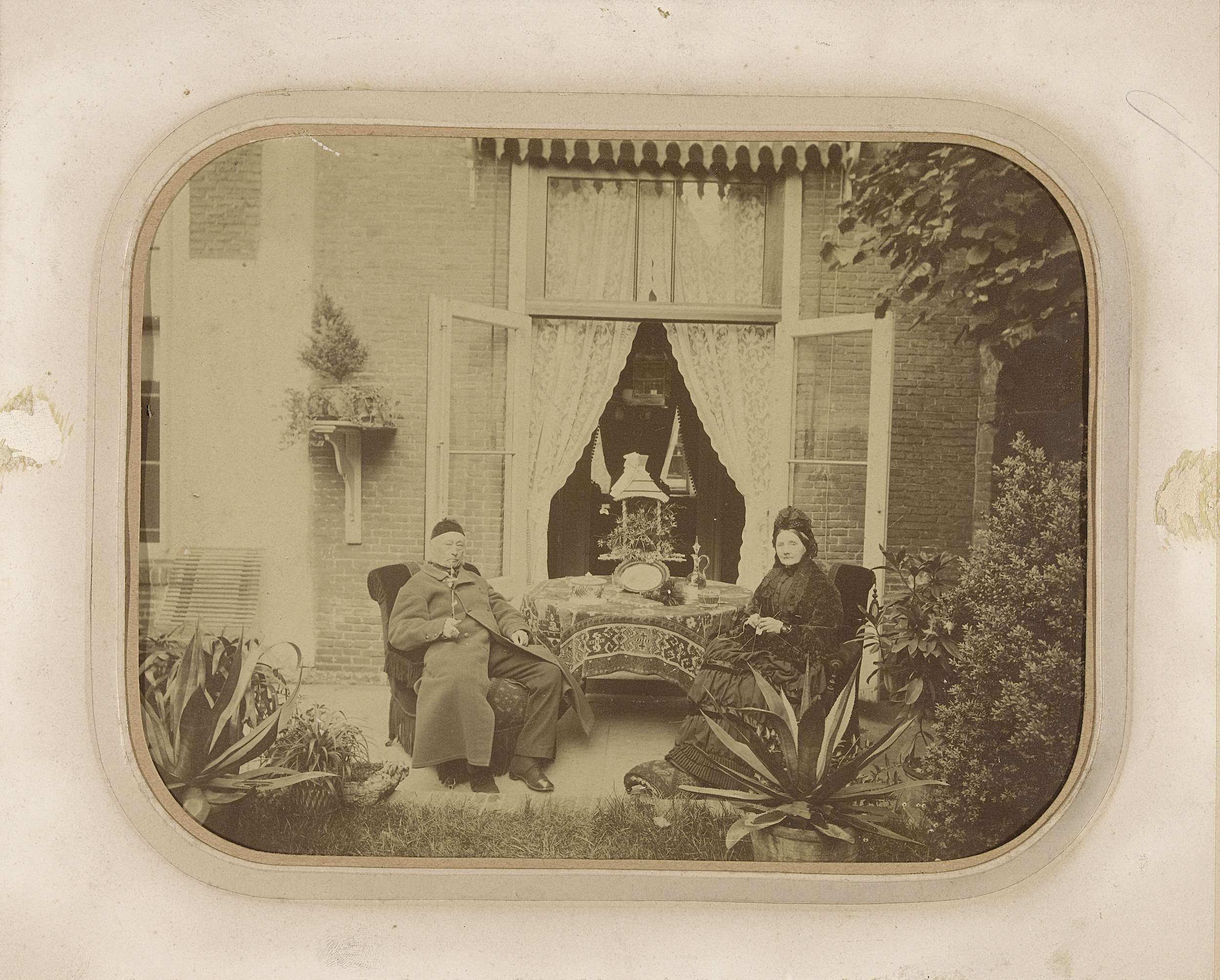 Portret van een bejaard echtpaaraan tafel op een ver...
