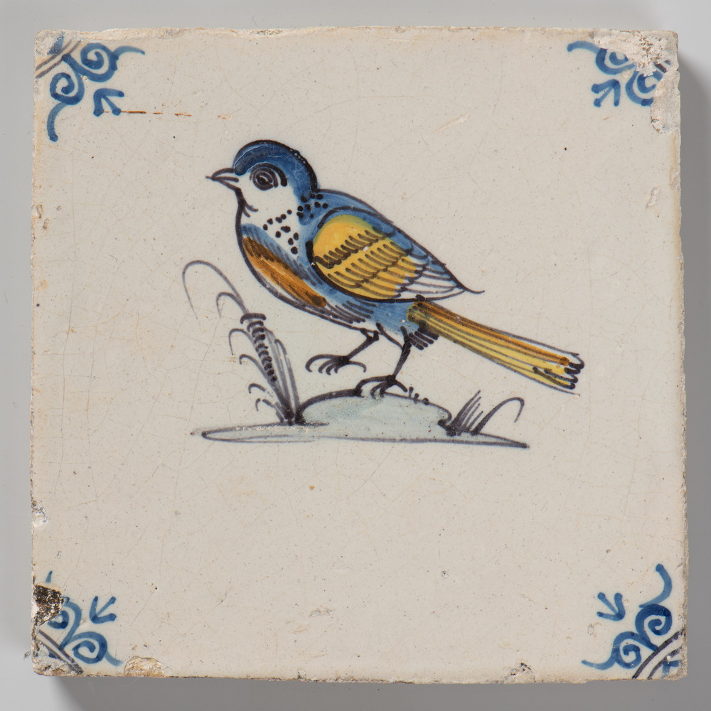 tegel van keramiek met tinglazuur, voorstellende: vo...