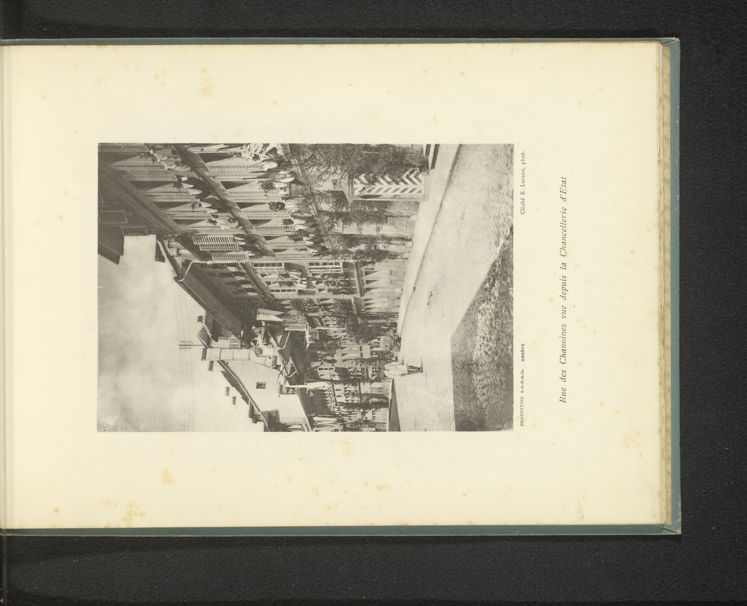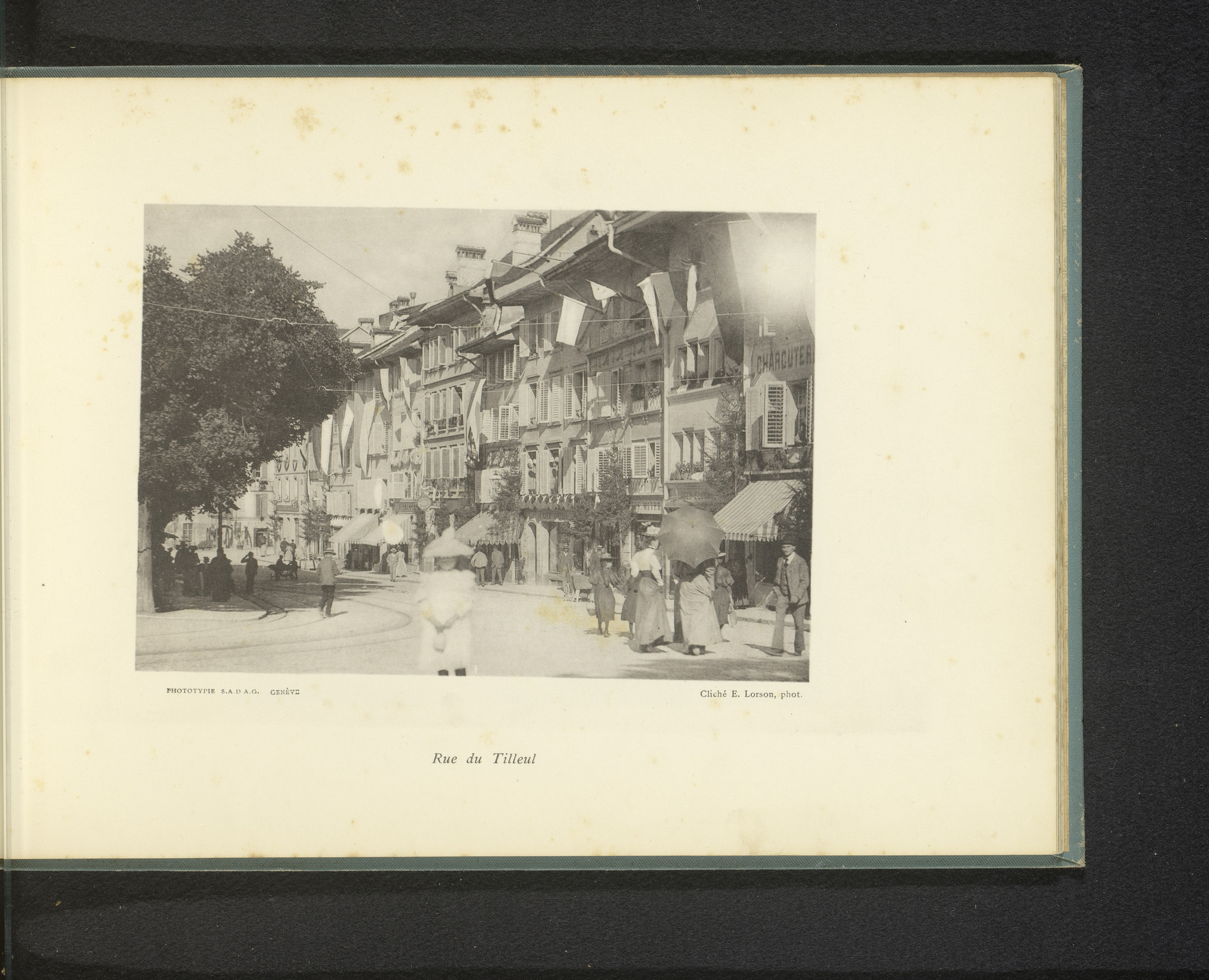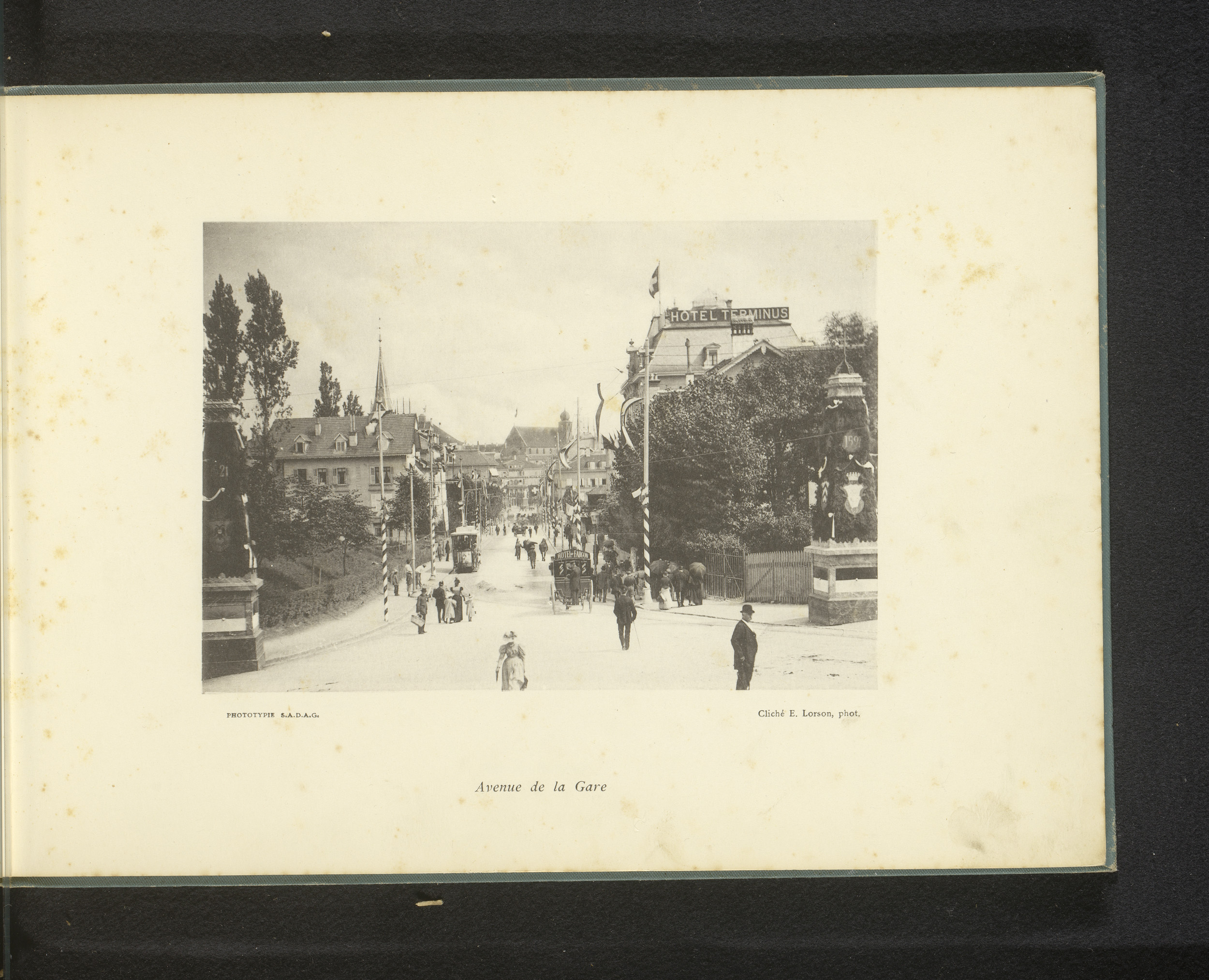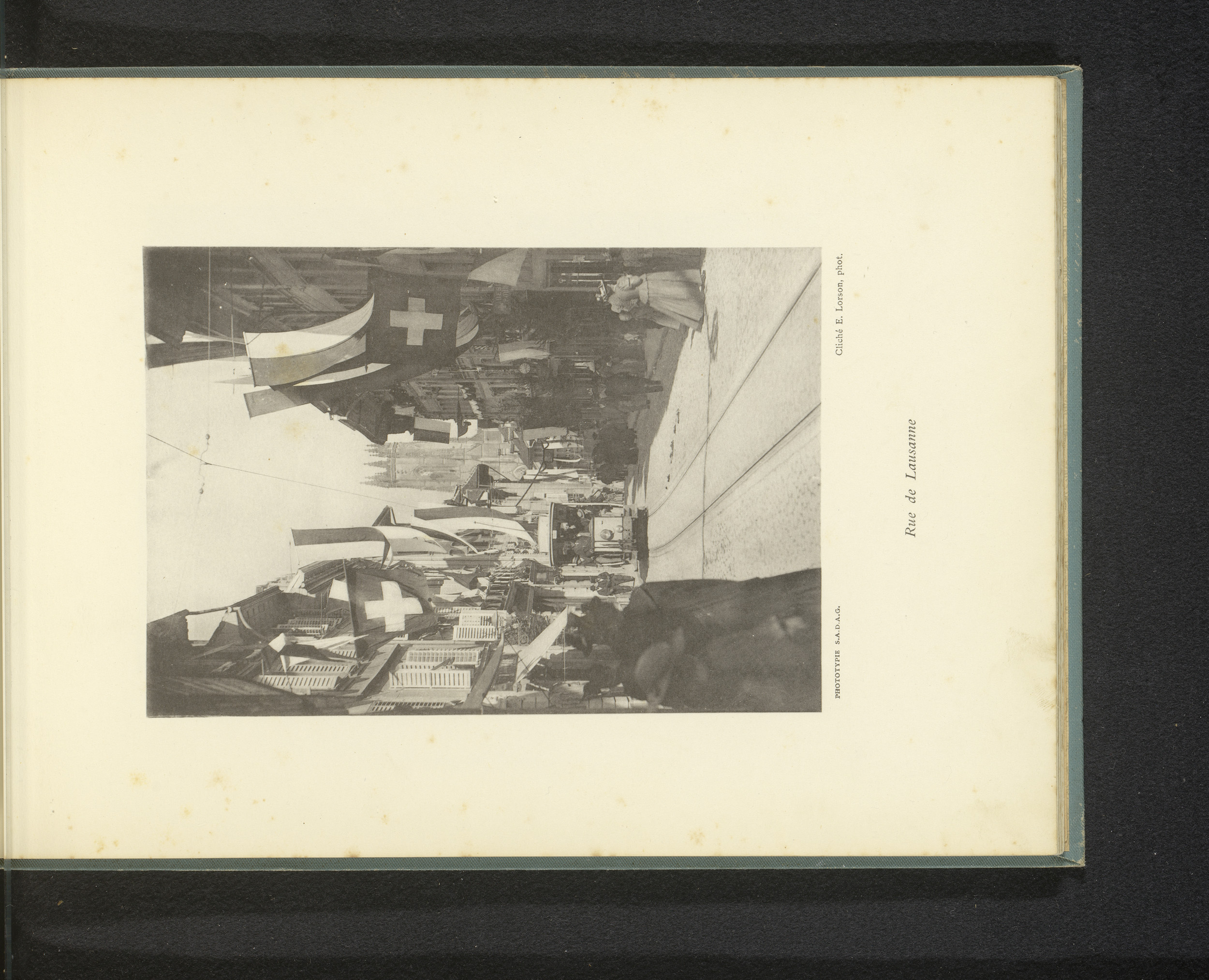 Gezicht op de Rue de Lausanne met vlaggen en de kath...