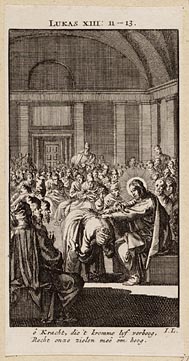 In een groot met mensen gevuld vertrek legt Jezus zi...