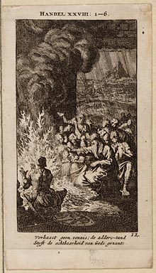 Paulus schudt de adder in het vuur na de schipbreuk ...