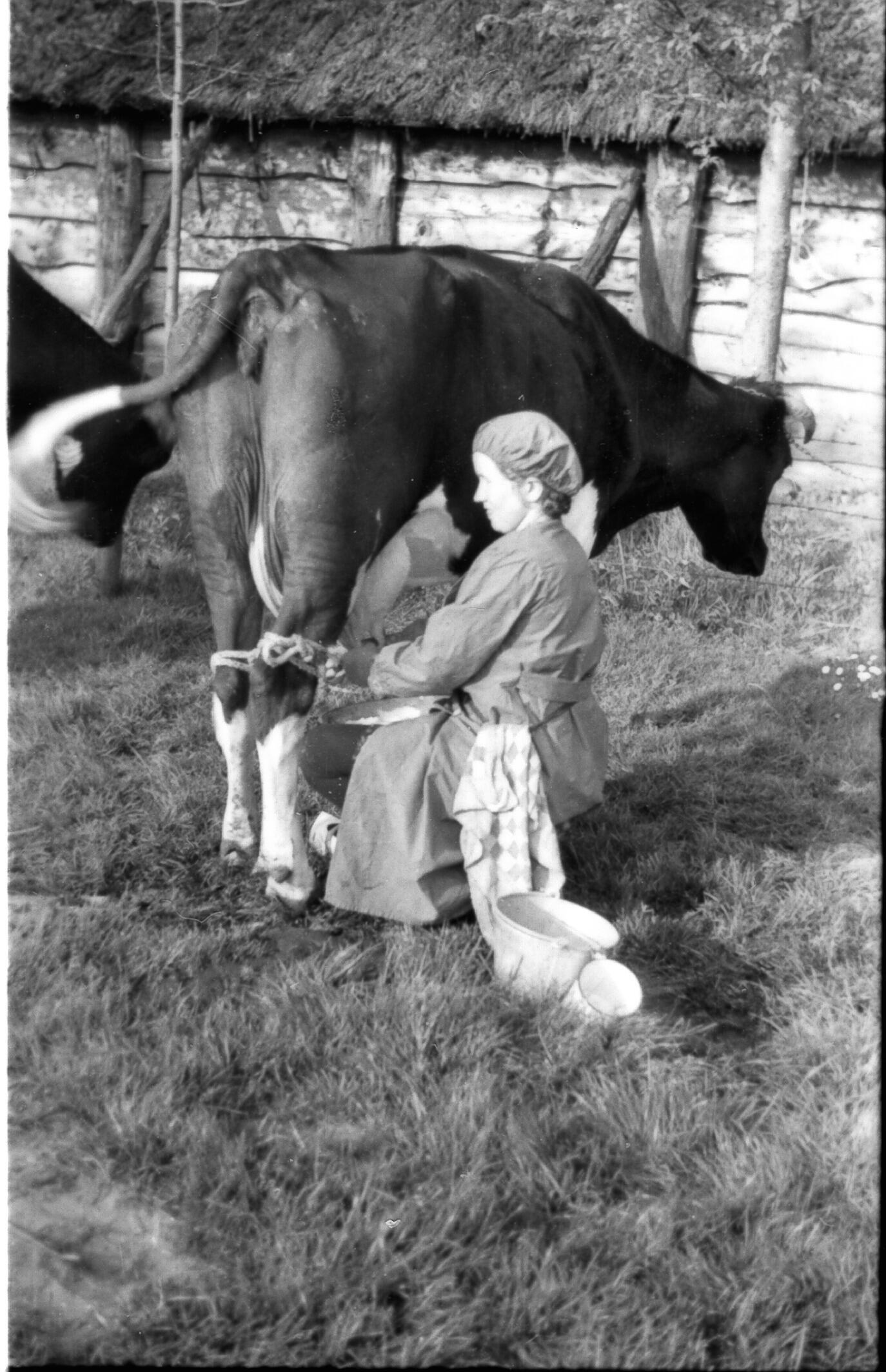 Het melken van een koe, Overwoud, 1938 (zwart-wit foto)