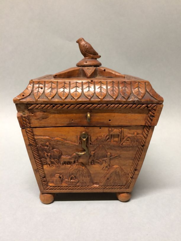Theekistje op bolpootjes met snijwerk van boerenleven