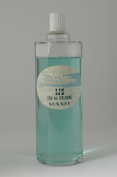 Grote glazen fles met witte dop, "IJS / eau de colog...
