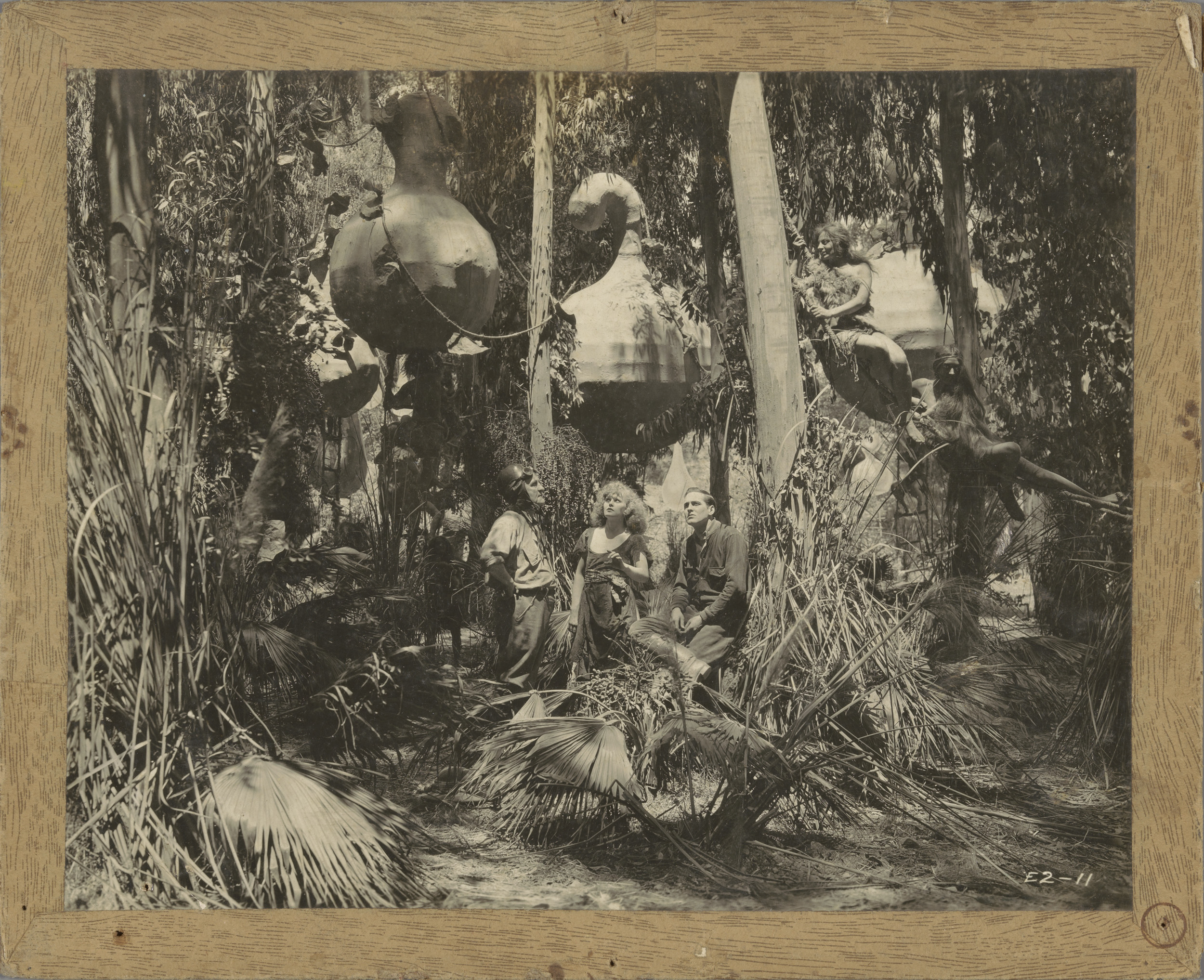 filmstill met drie acteurs in oerwoud met vrouwen en...