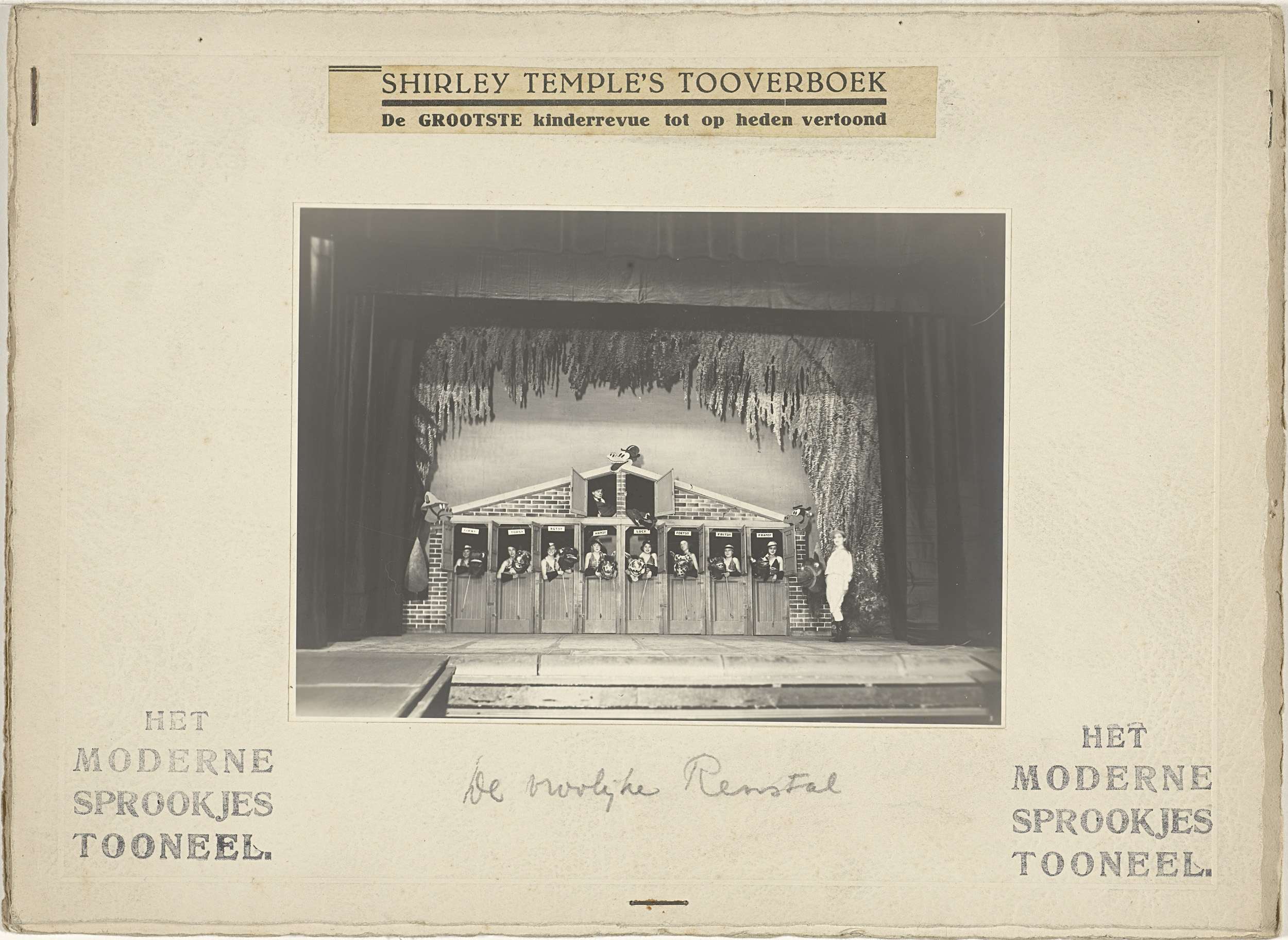 Theaterfoto van acteurs in decor met paardestal