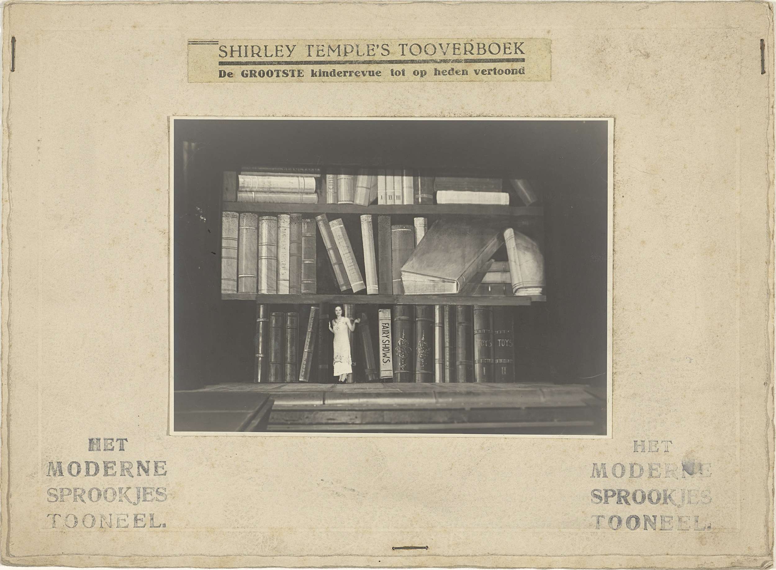 Theaterfoto van actrice voor decor van reuzenboekenp...