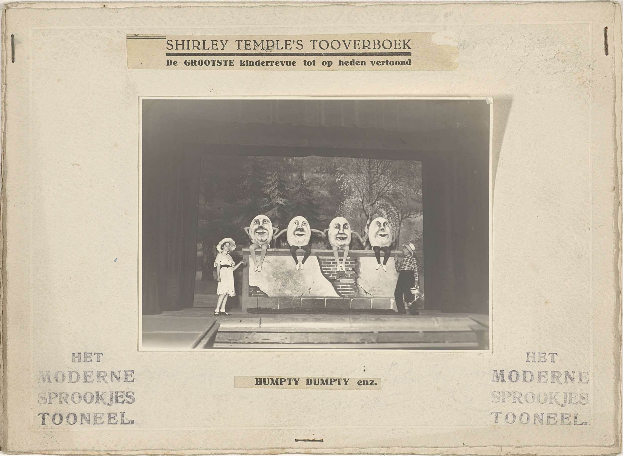 Theaterfoto van acteurs als Humpty Dumpty's en Alice...