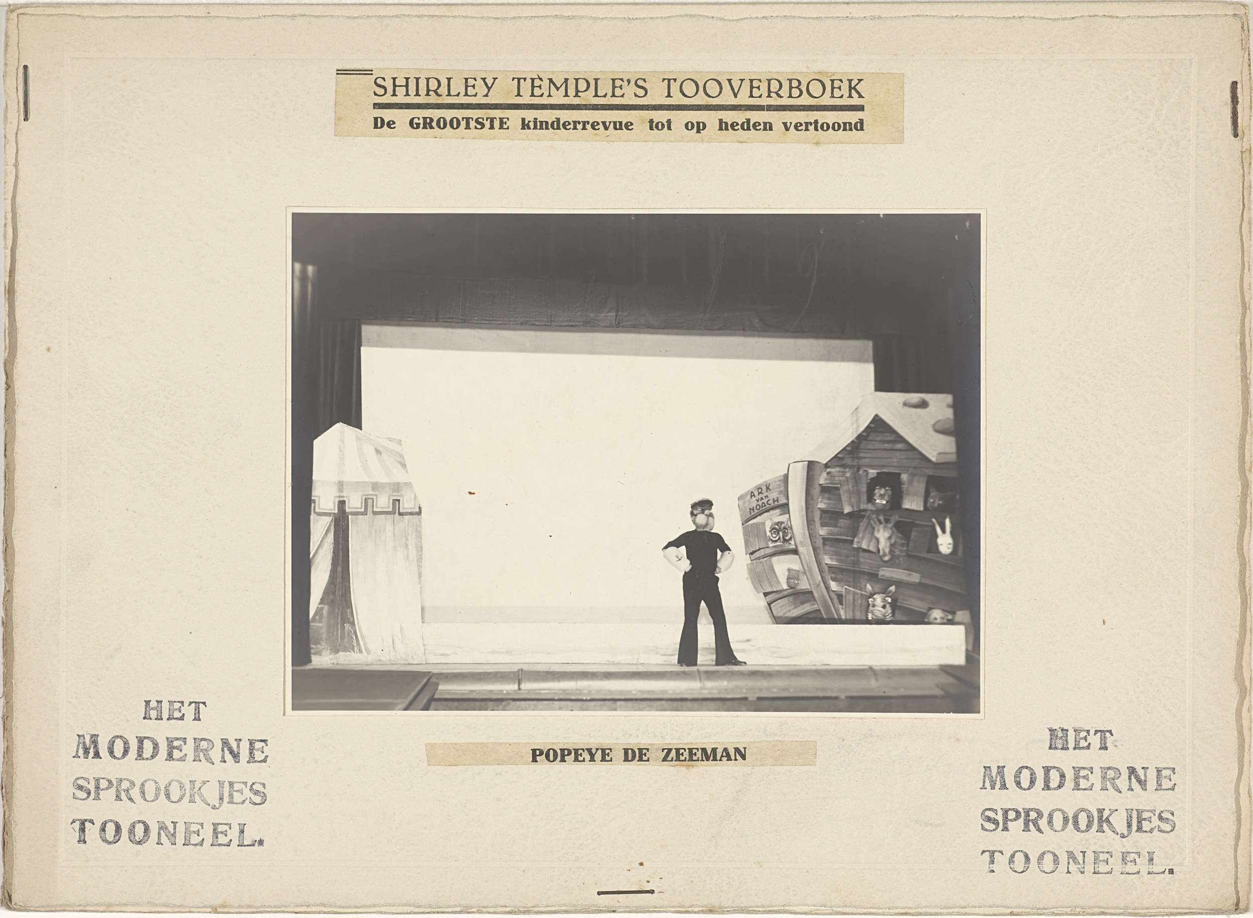 Theaterfoto van een acteur voor het decor met de Ark...