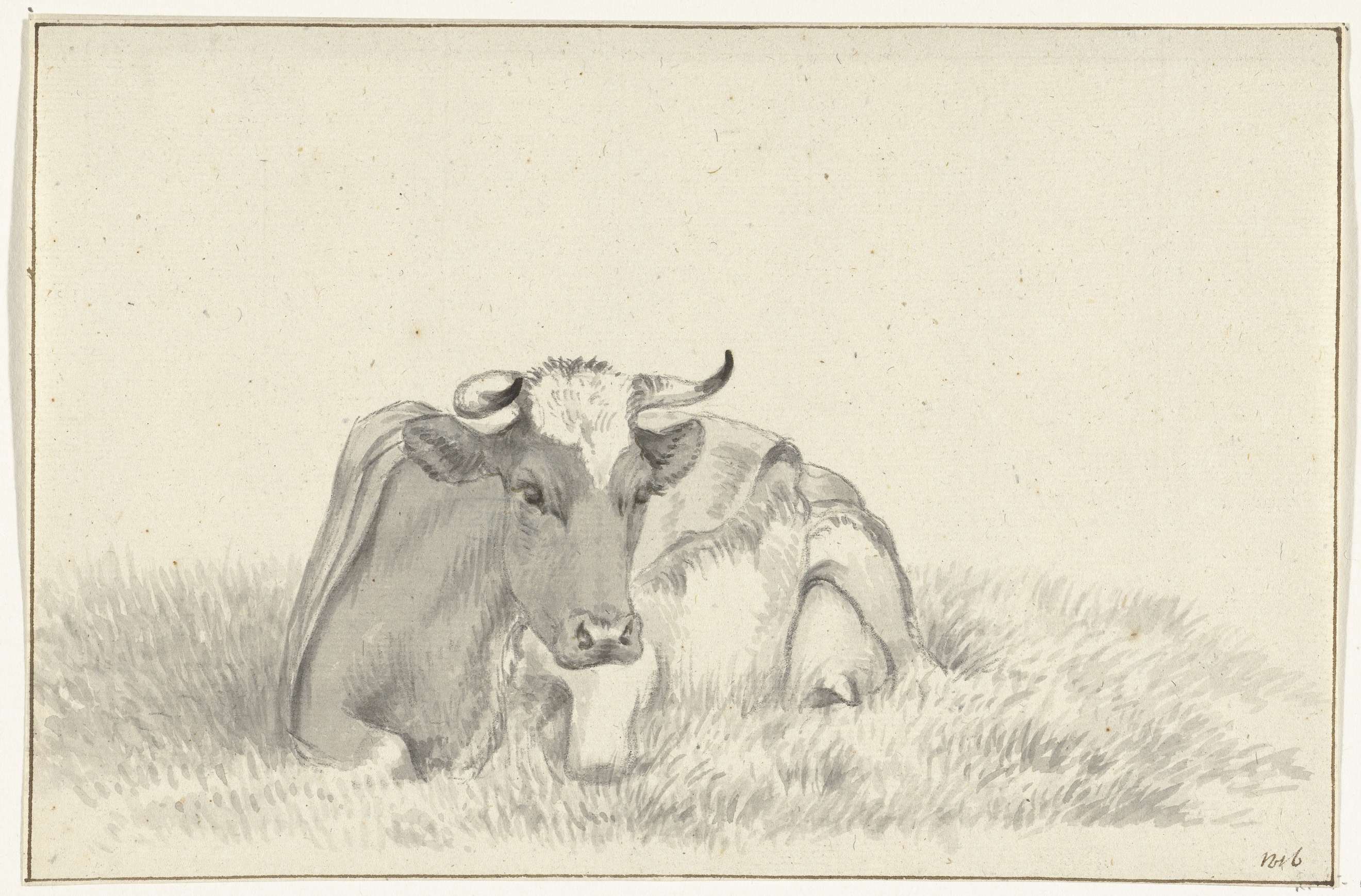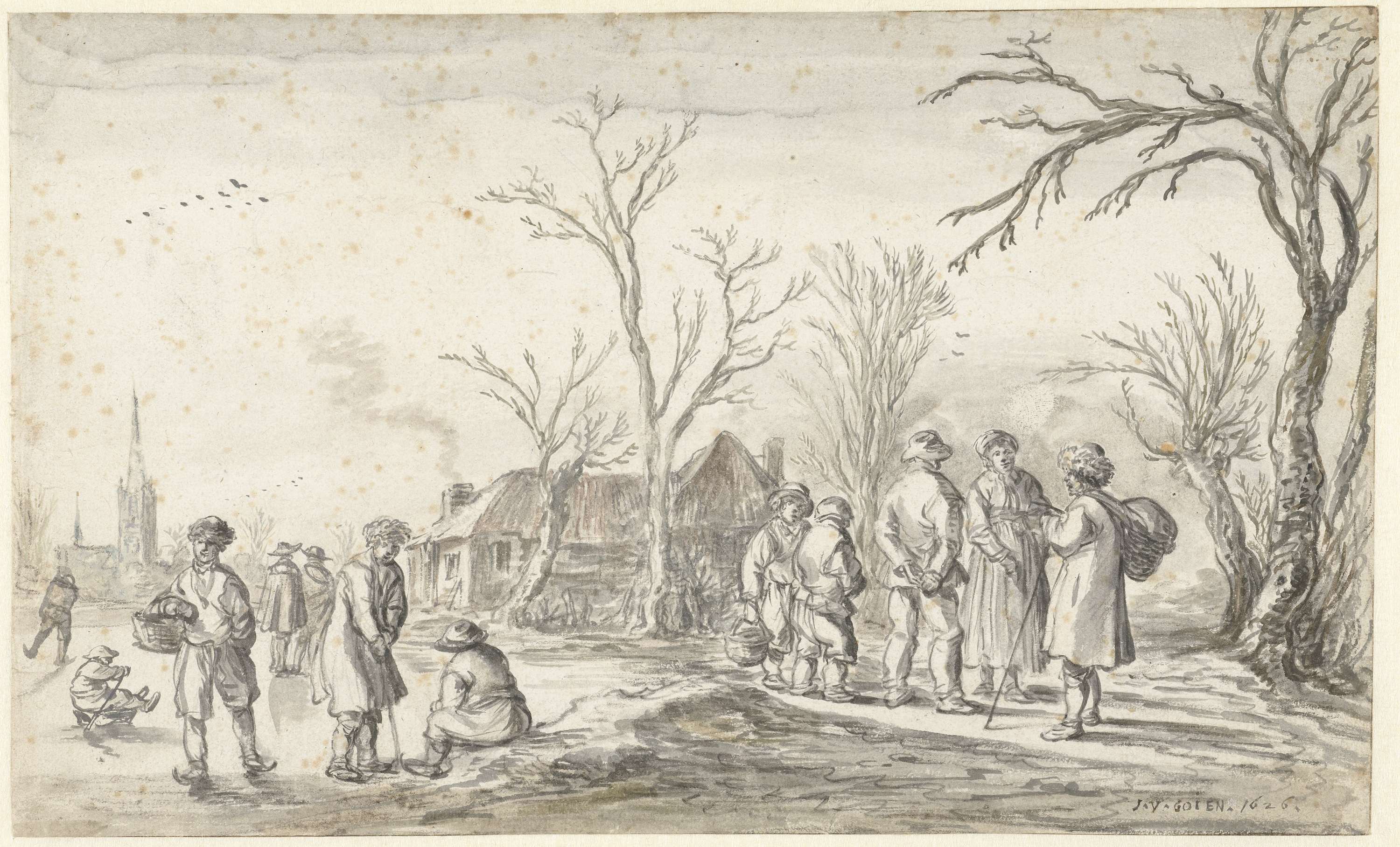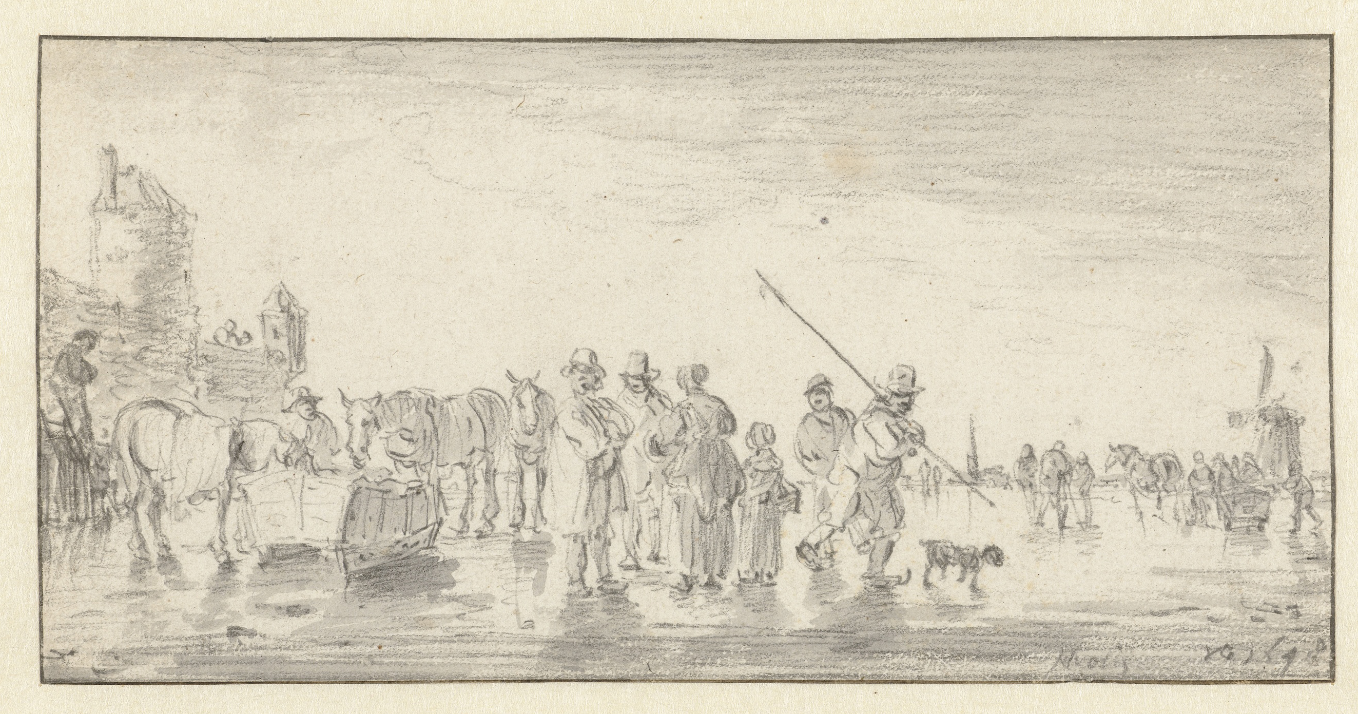 Studieblad met boerenwagens, vee, landlieden en ruiters