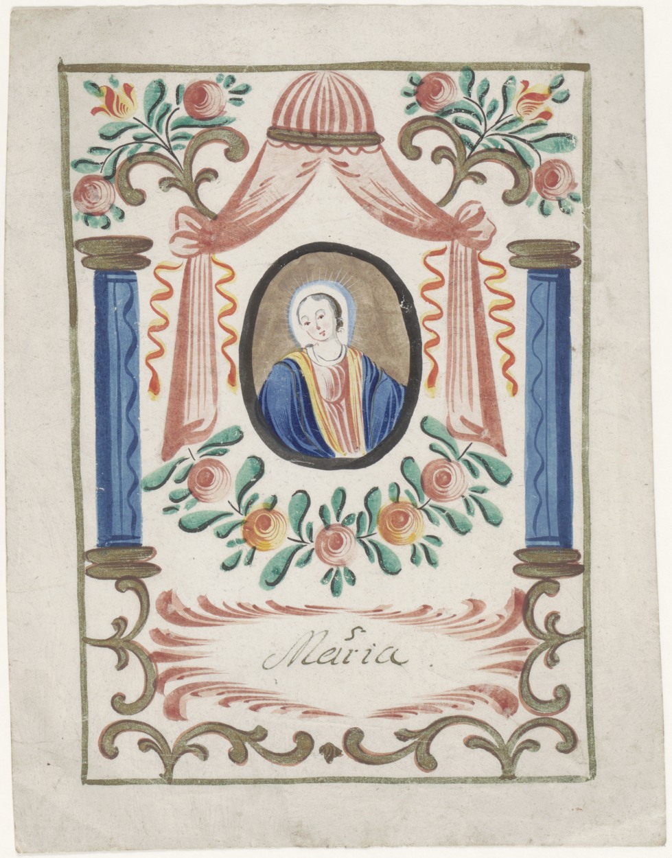 Maria, omringd door rozen hart en engelen, ingekleurd