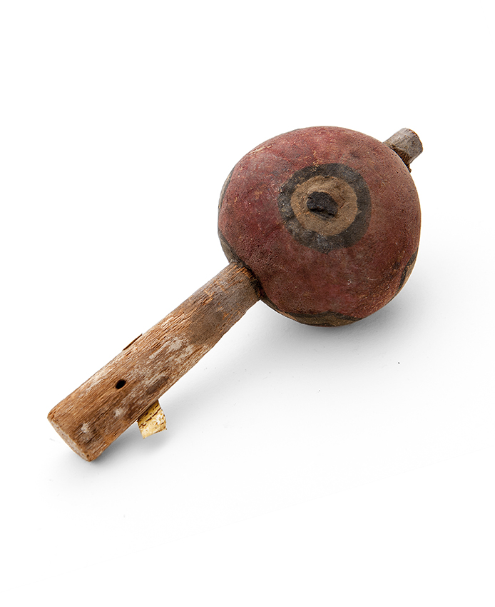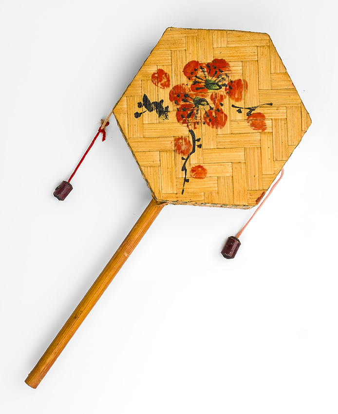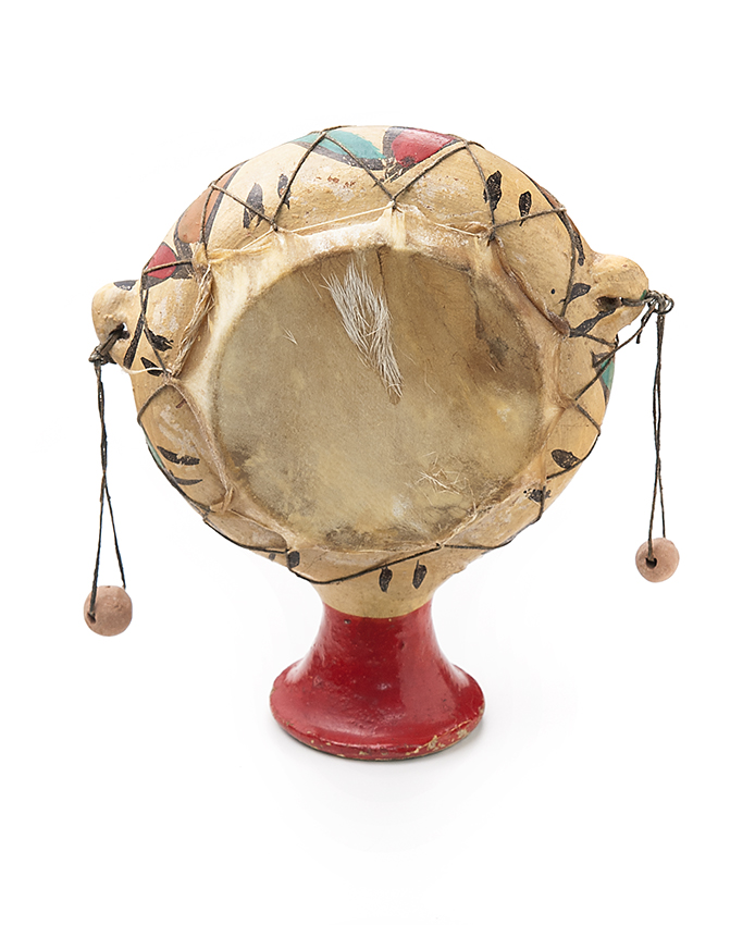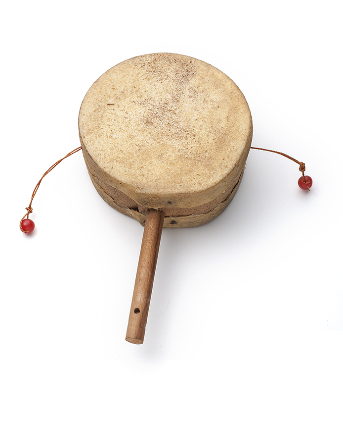 Trommelratel, leren trommel met rode kralen klappers...