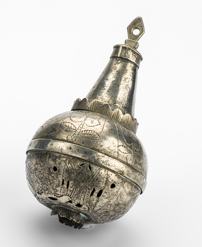 Bolvormige rammelaar met gegraveerde bloemdecoratie