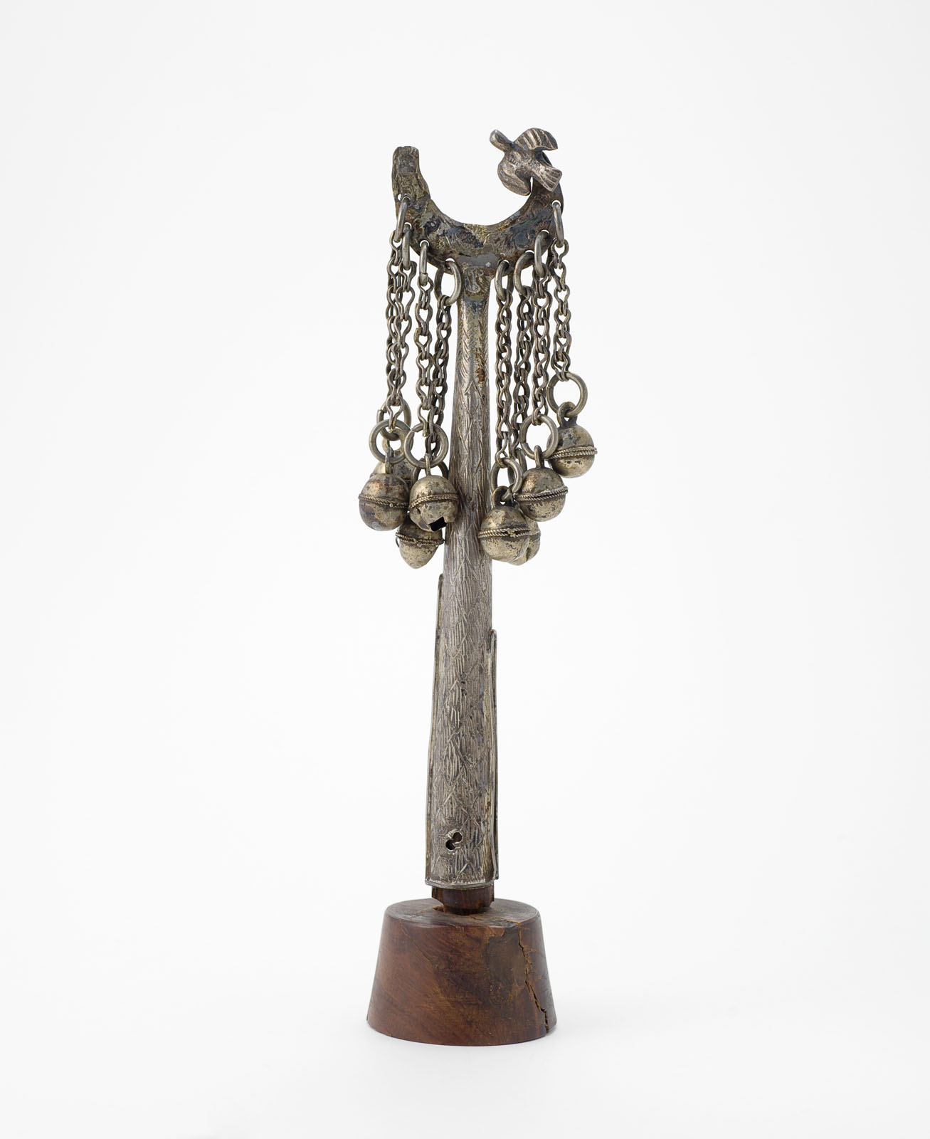 Metalen vogeltje met afhangende kettingen met belletjes