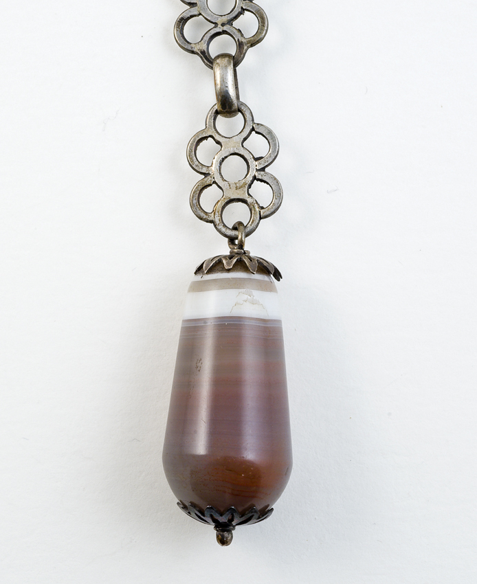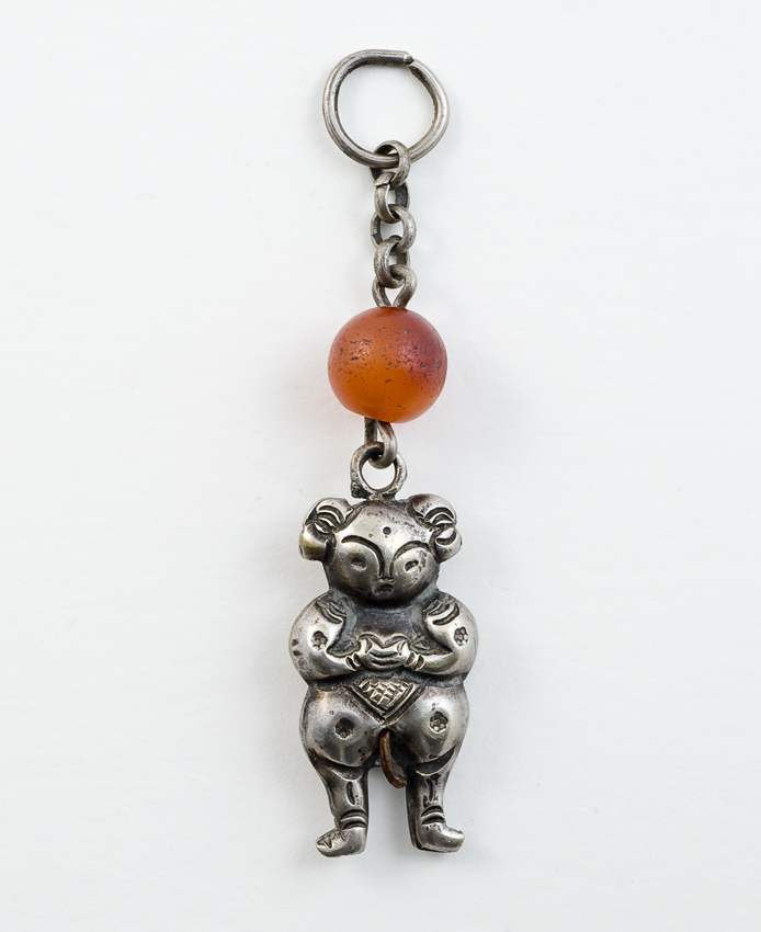 Metalen mens(?)figuur aan ketting met bolletje van e...