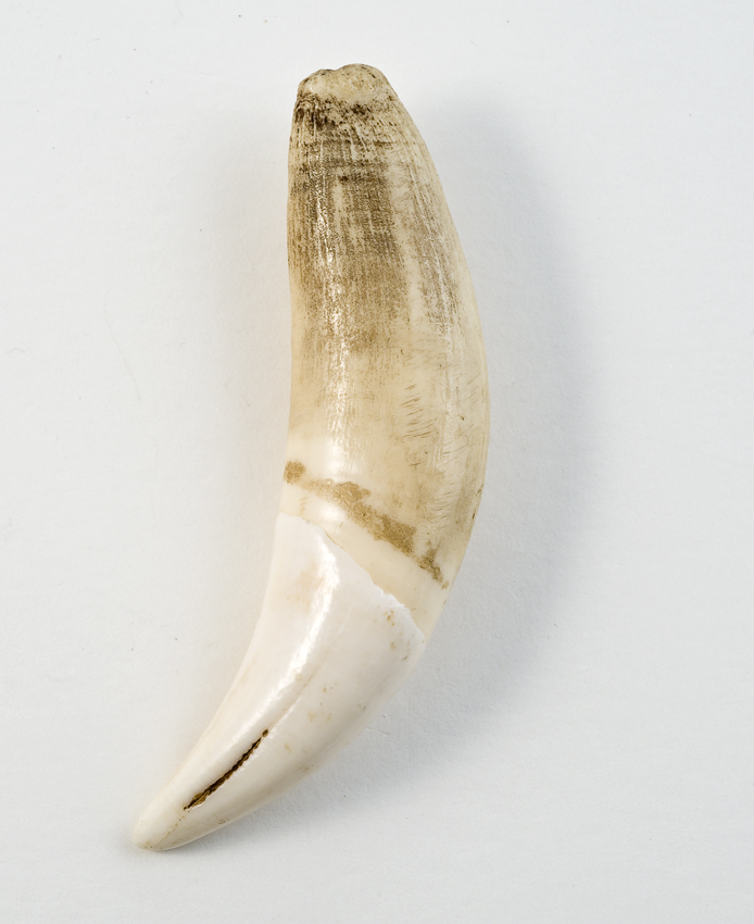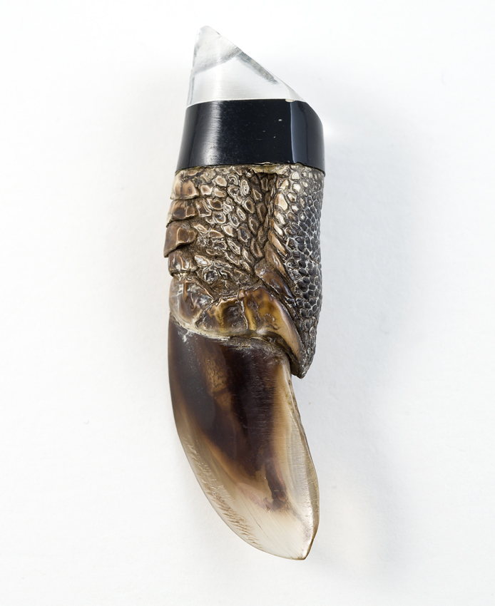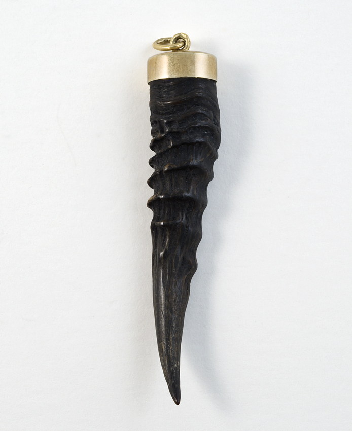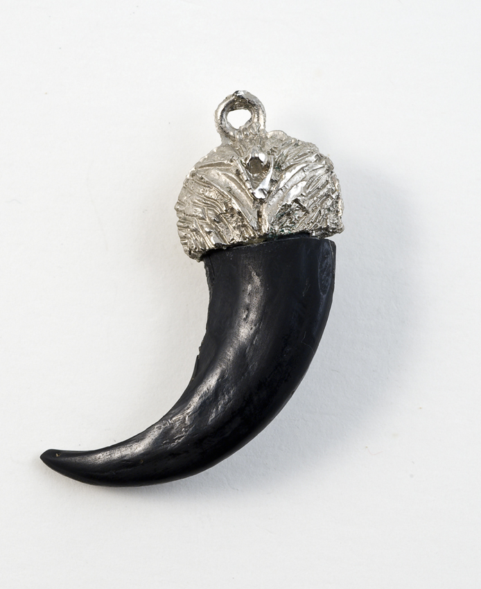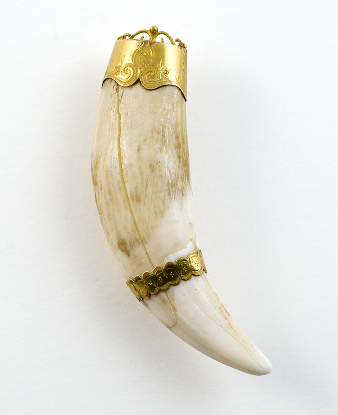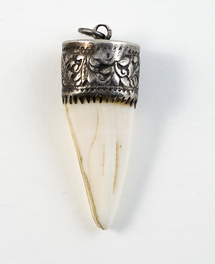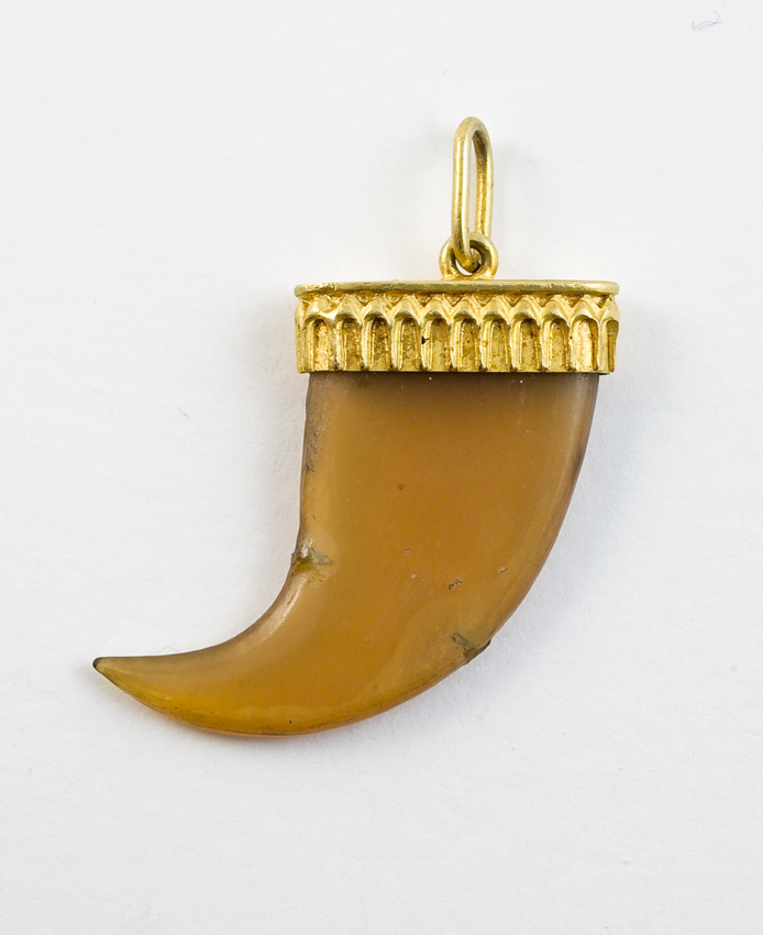 Tand of hoornvormige amulet in metalen zetting