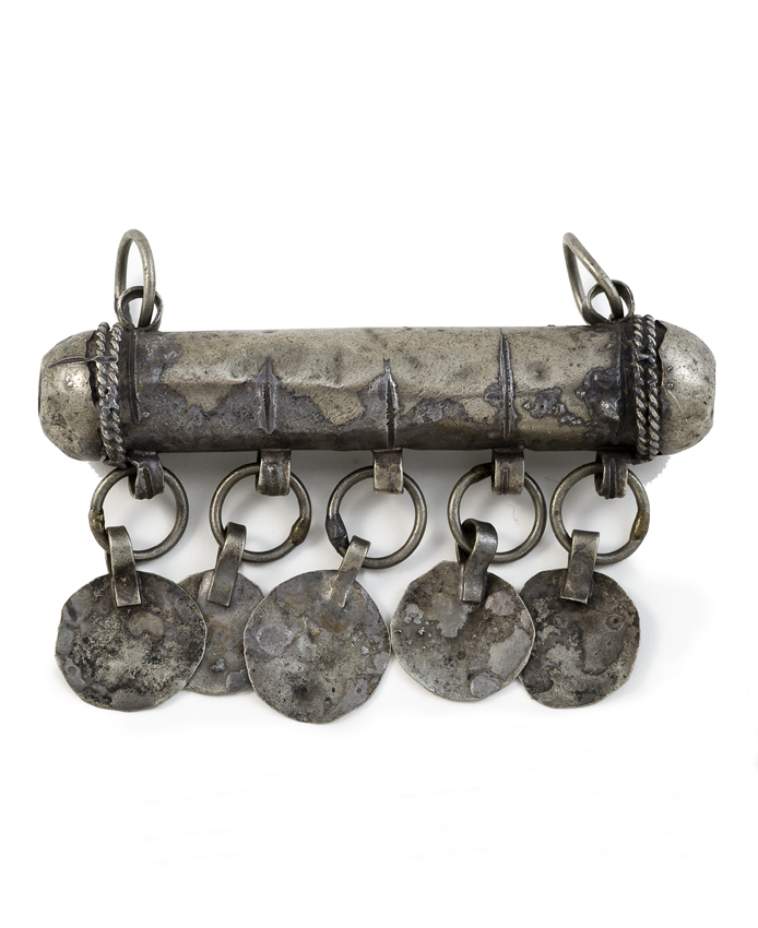 Cilindrische metalen hang amulet met vijf schijfjes ...