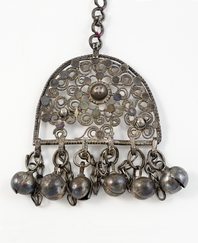 Metalen amulet. halve bolvorm met decoratie in ruitp...