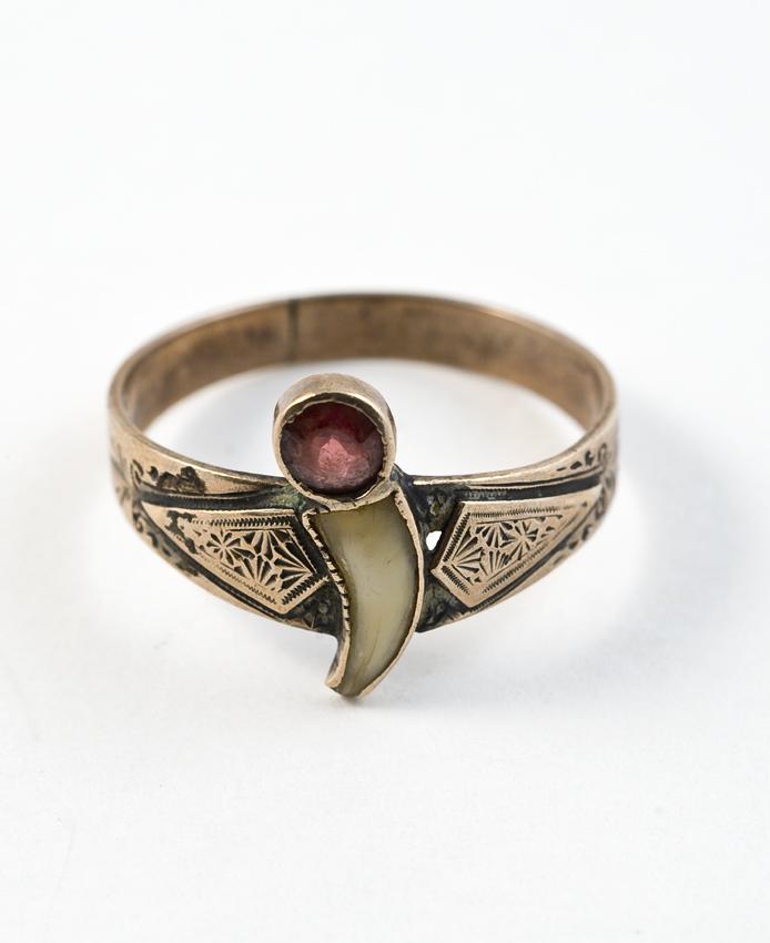 Zilveren ring met kleine tand en rood edelsteentje i...