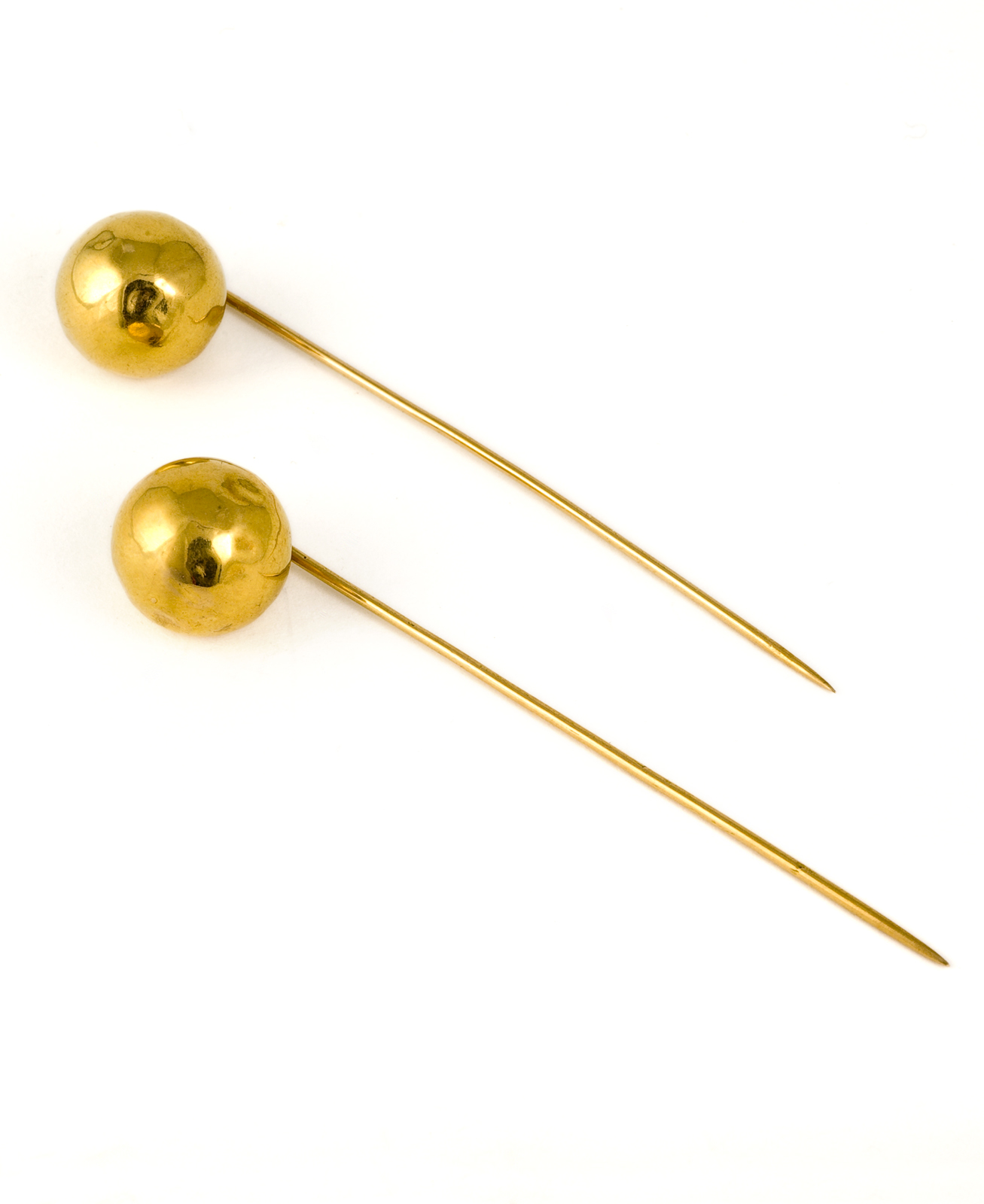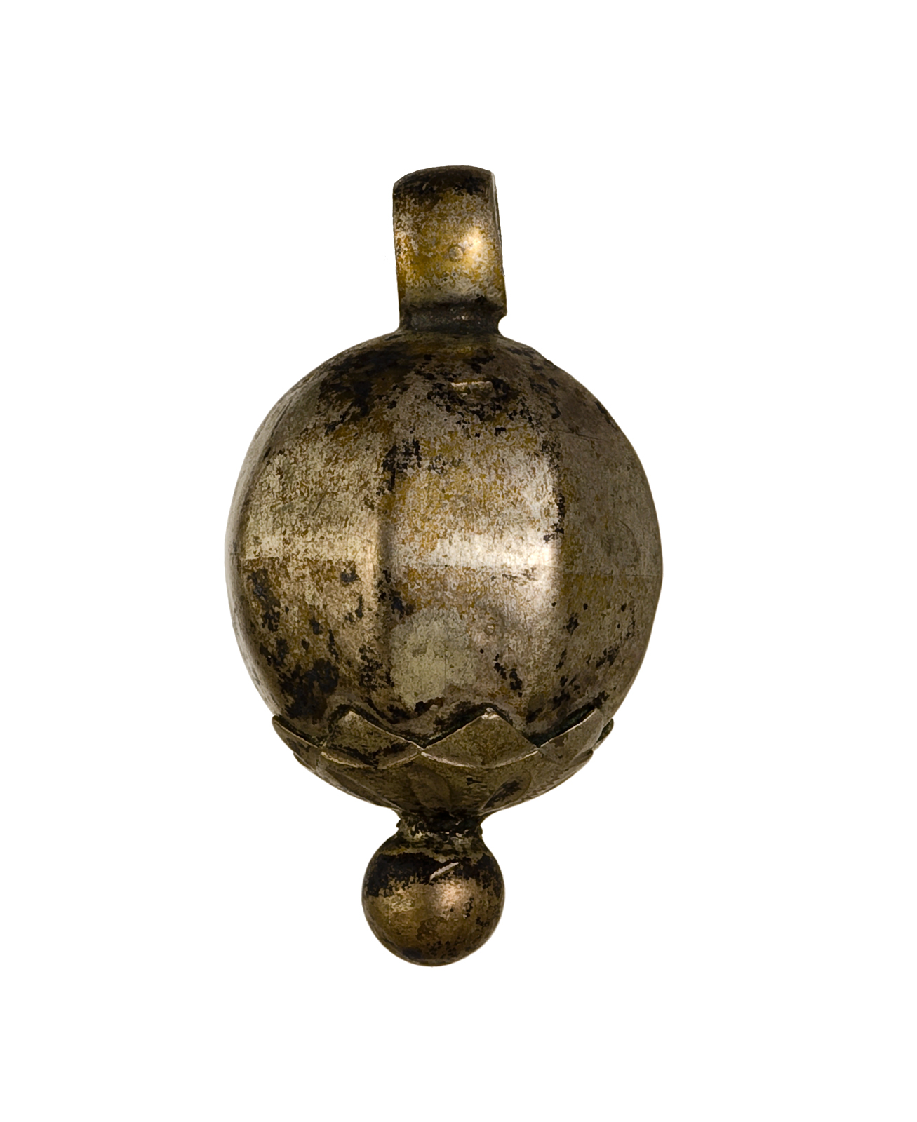 Bolvormige metalen amulet met goudkleurige decoratie.