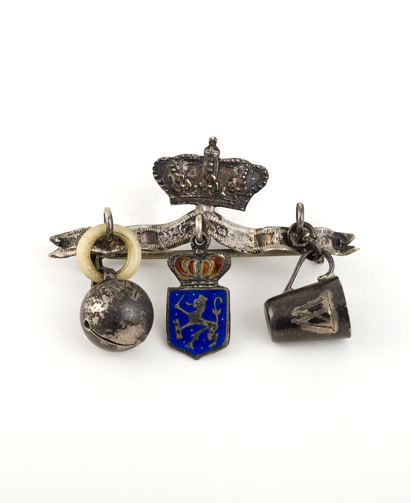 Zilveren rammelaar met een vogel op halve maan en be...