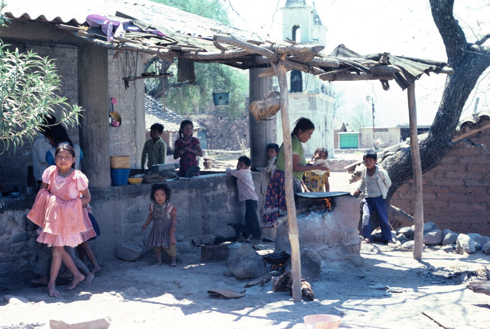 vrouw bij comal (bakplaat), omringd door kinderen