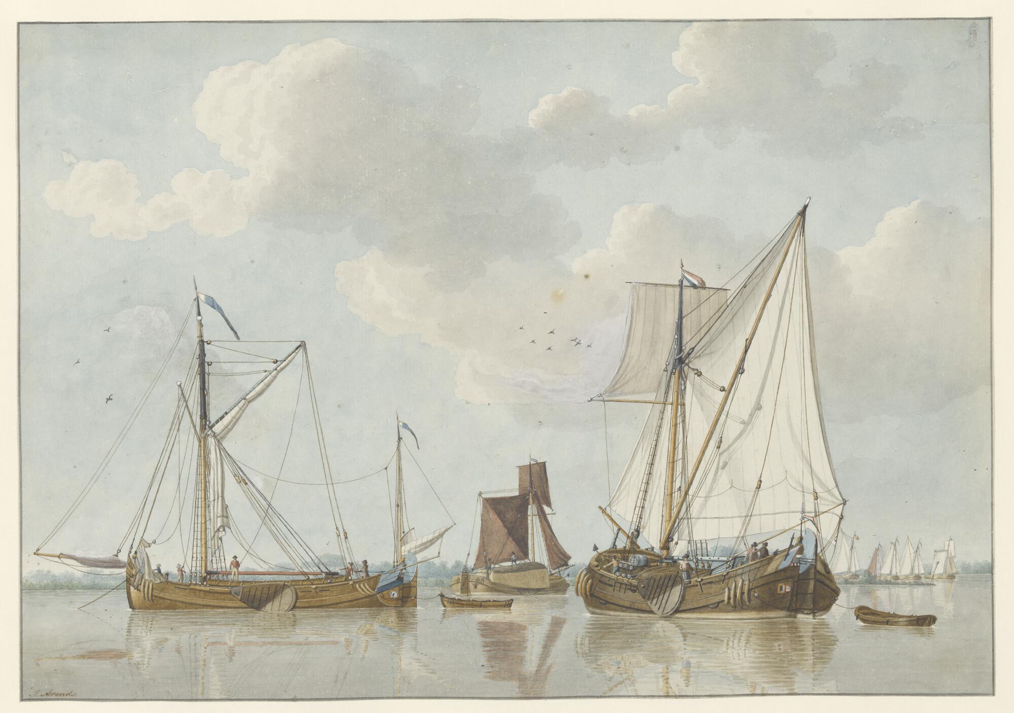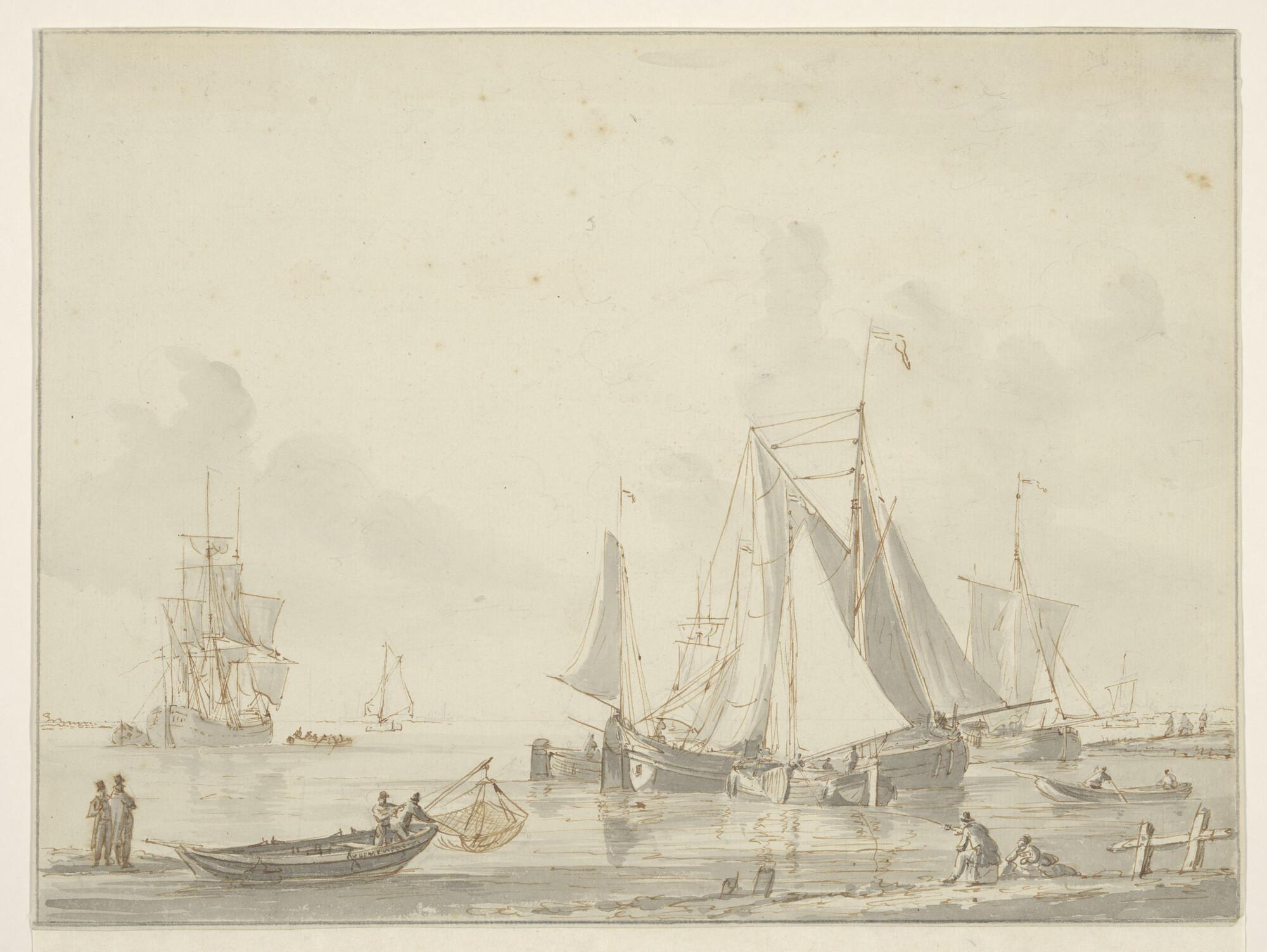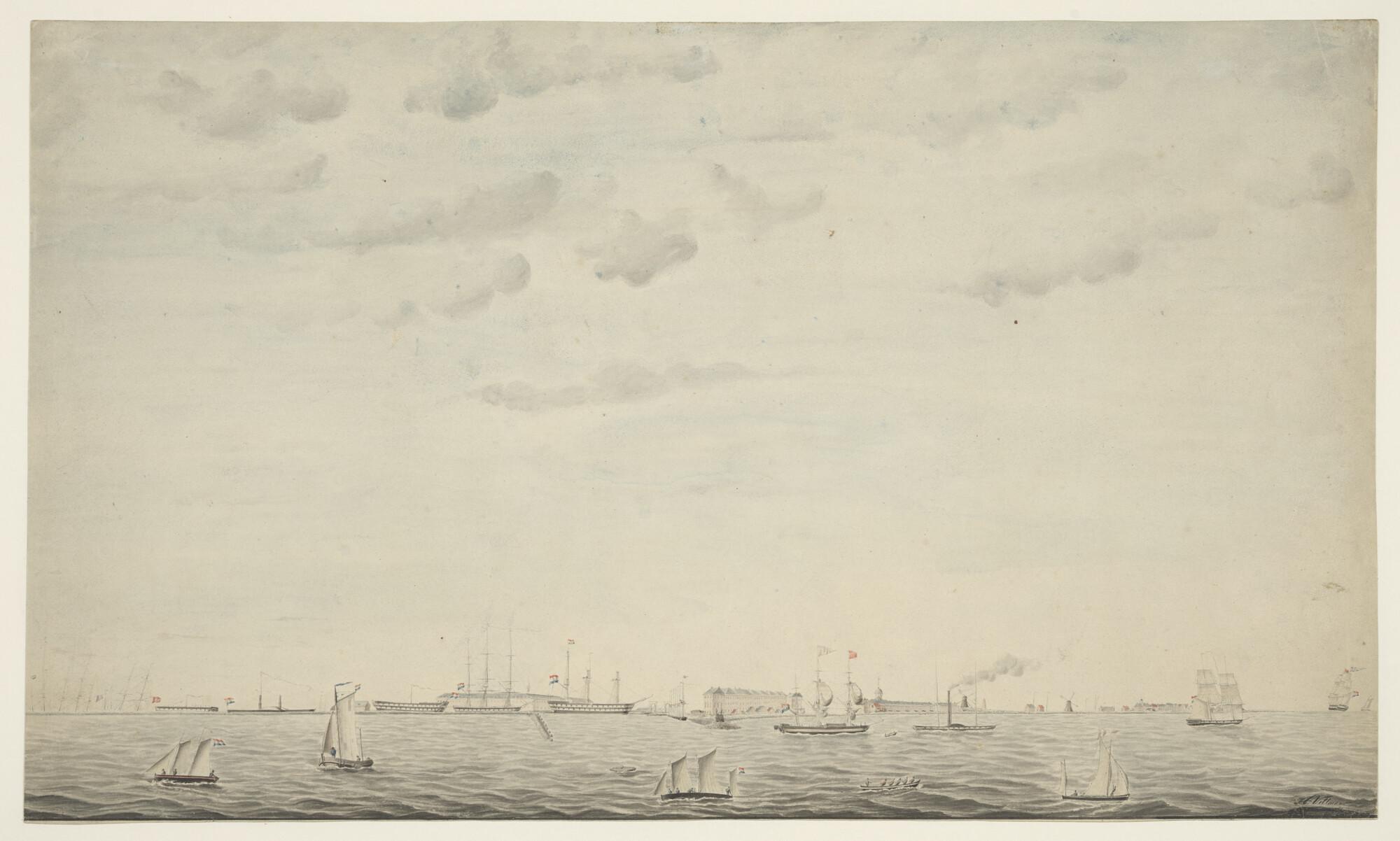 Rede met een zeilend spiegeljacht en een oorlogskotter