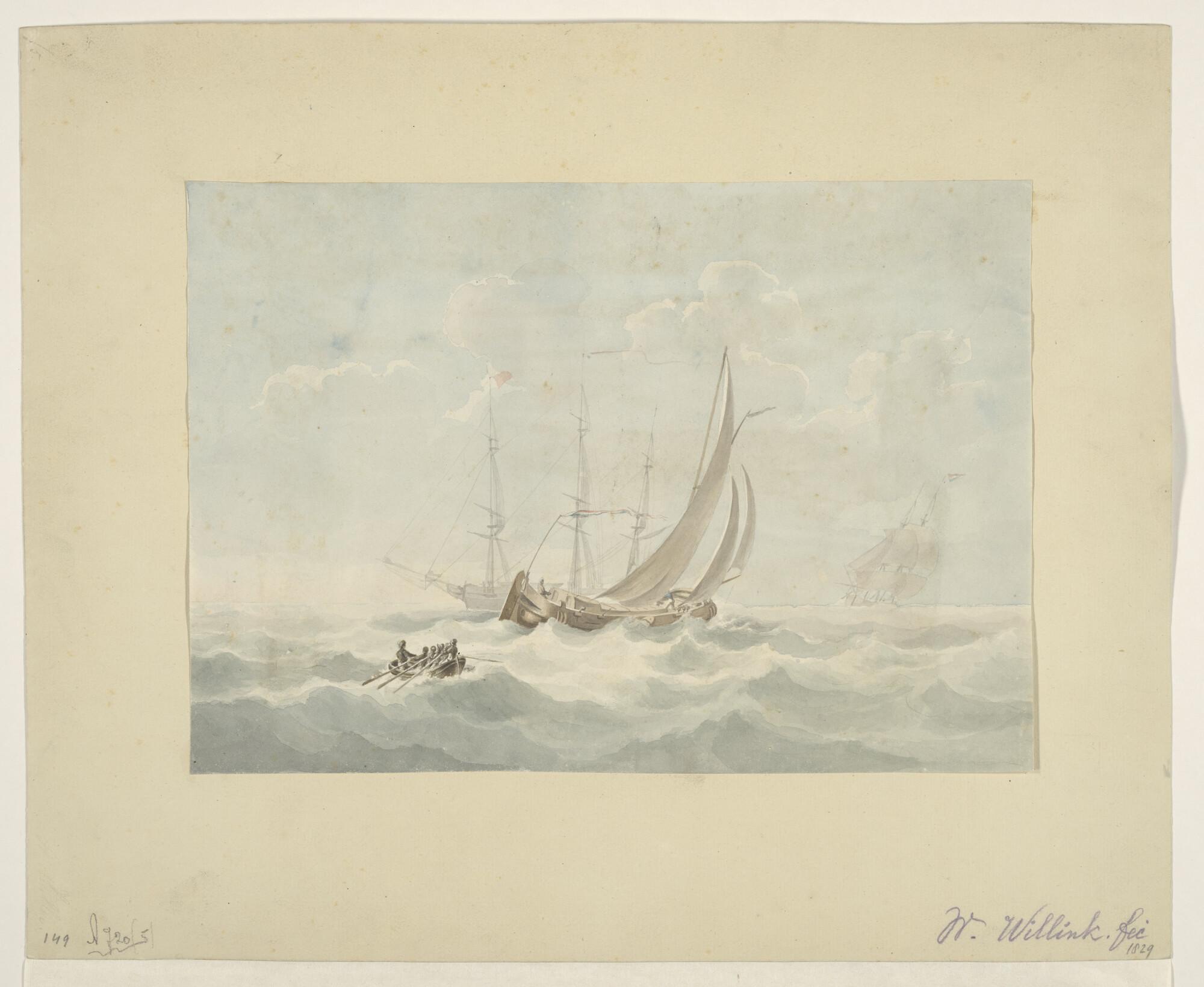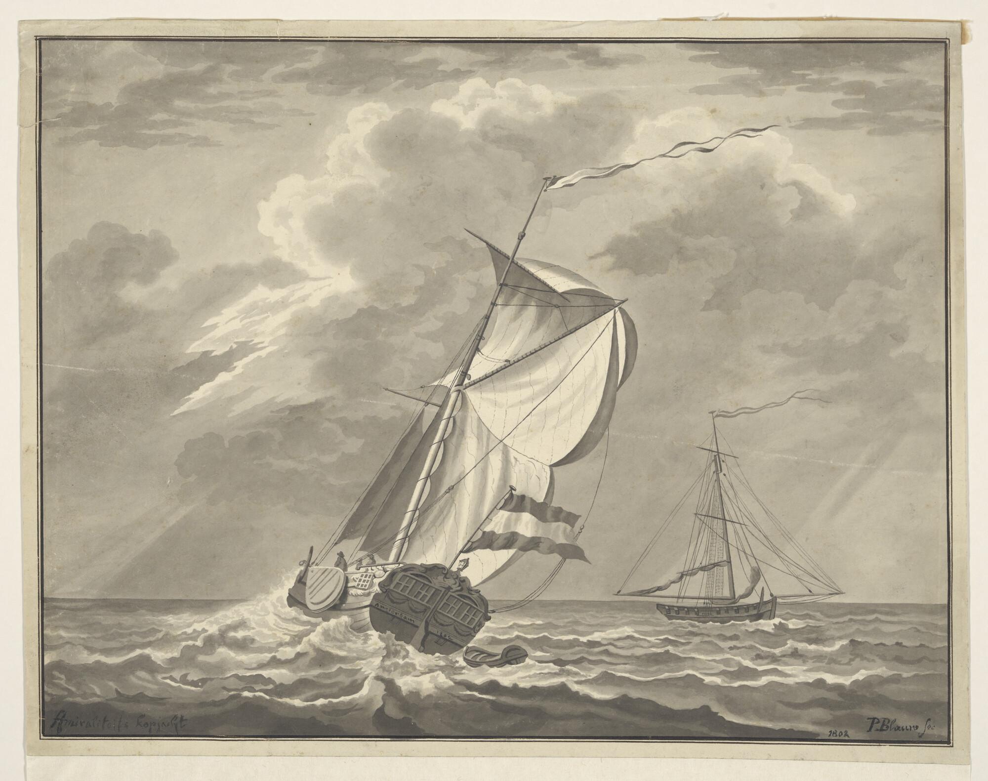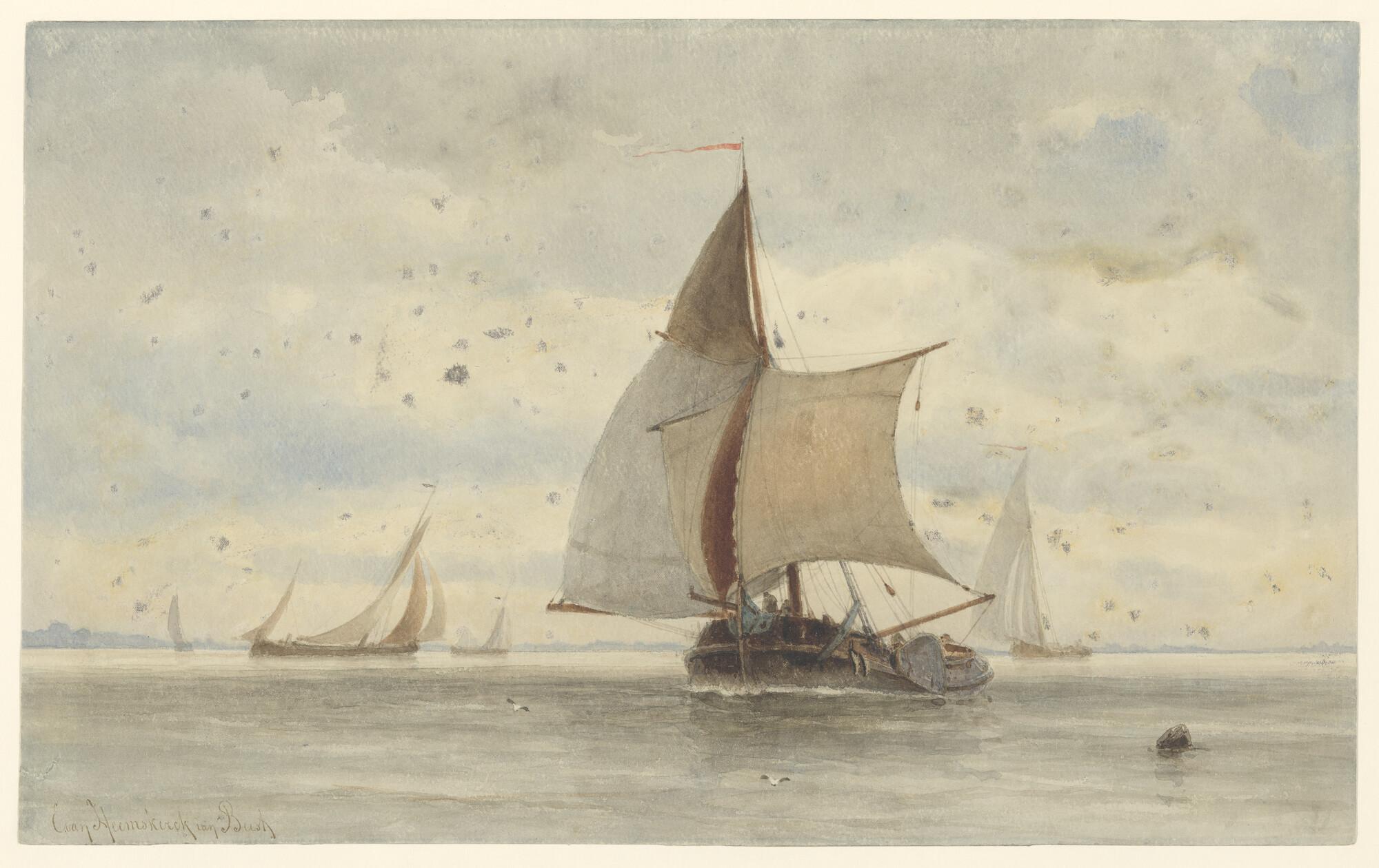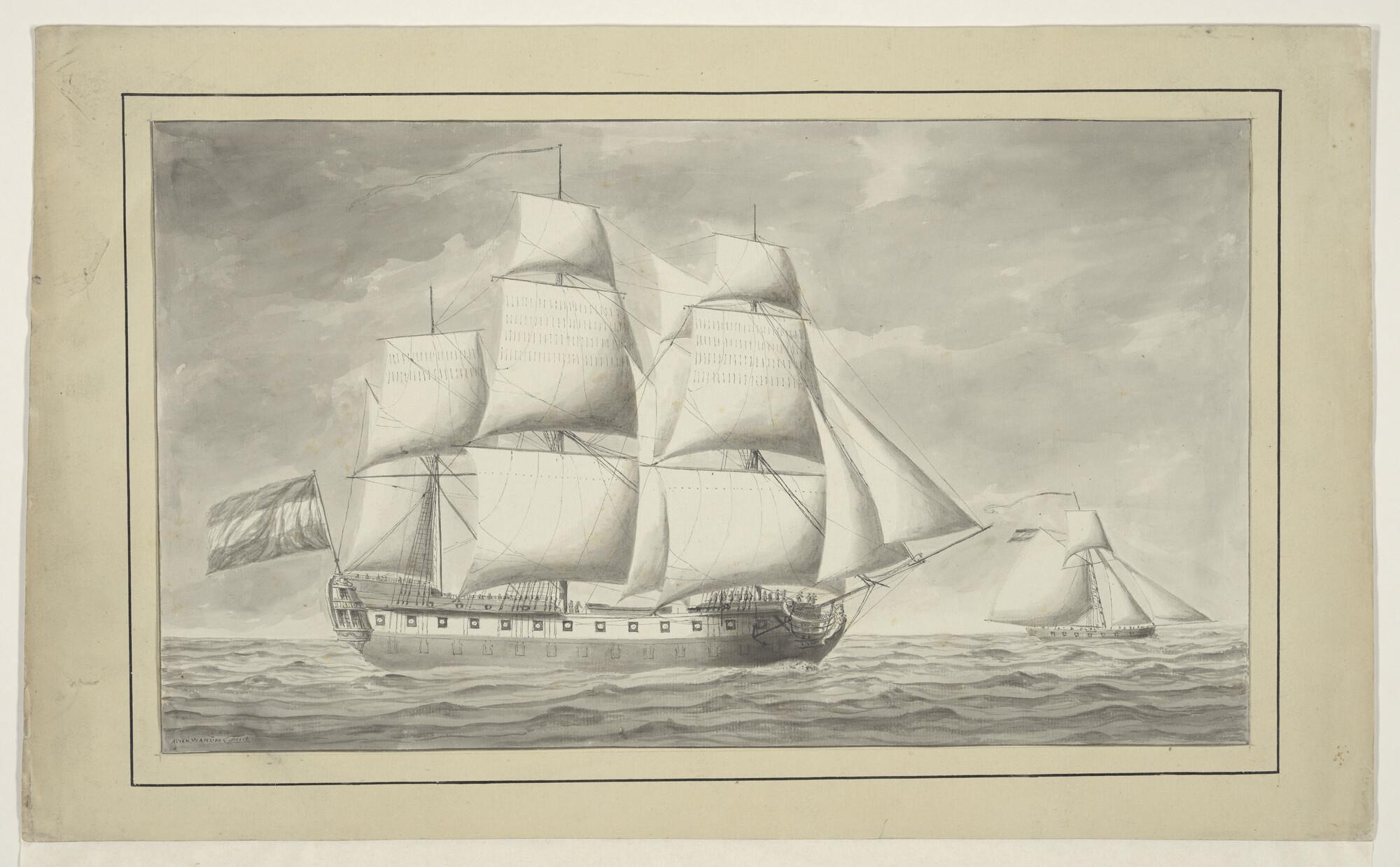 Rede met een zeilend spiegeljacht en een oorlogskotter