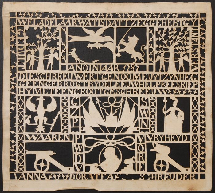 Knipkunst, wit papier op zwart fond, over gebeurteni...