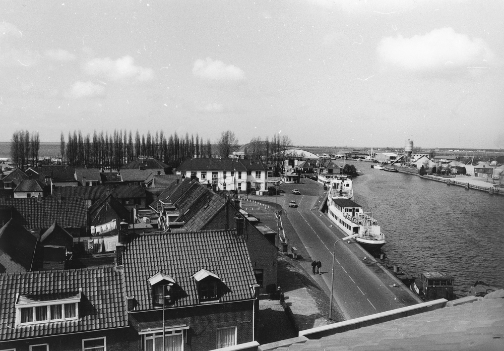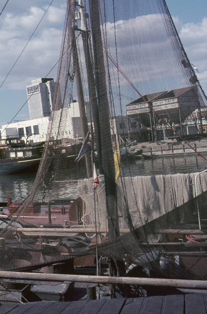 Vissershaven met schepen en de Asbestona-fabriek