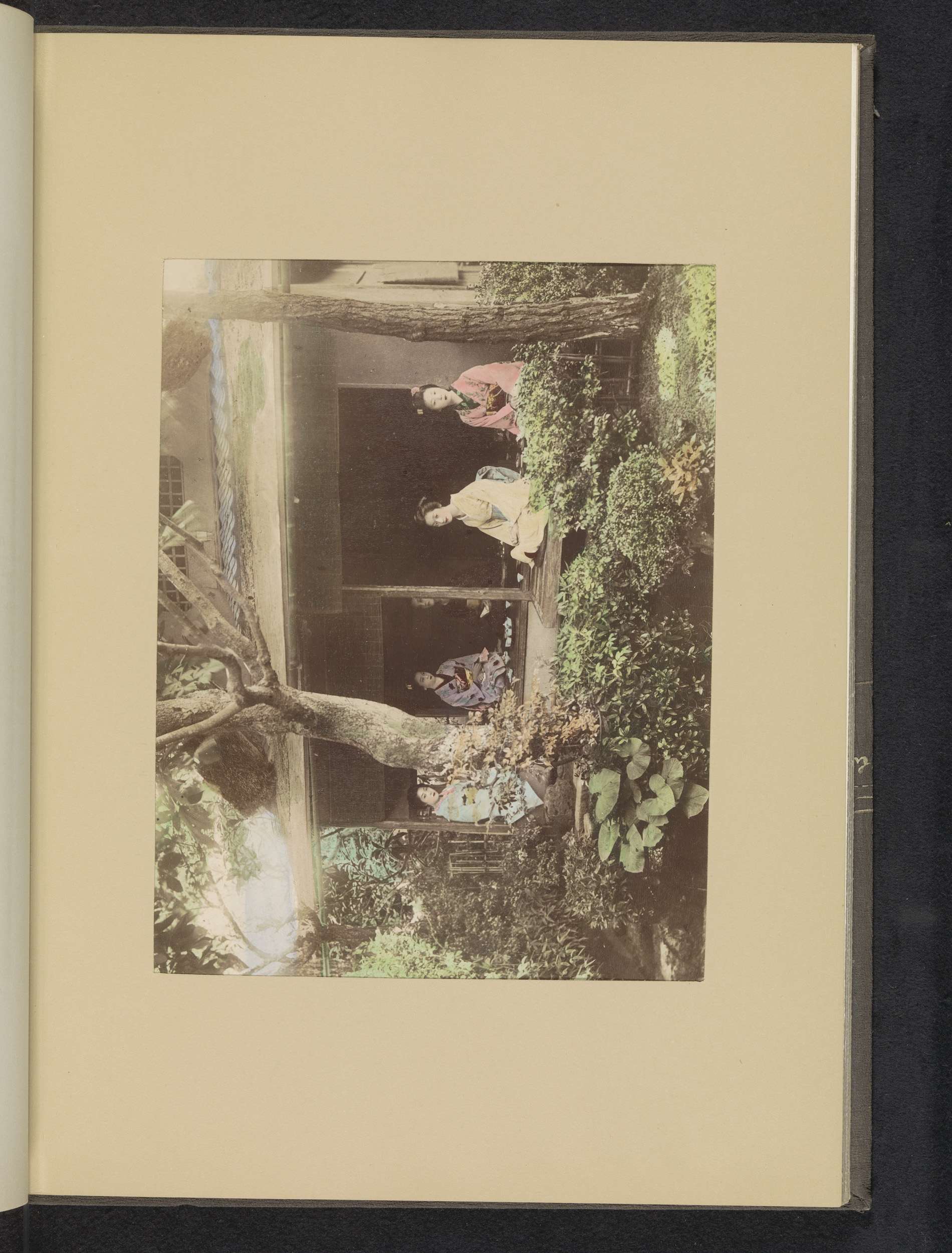 Drie zittende geisha's in een interieur