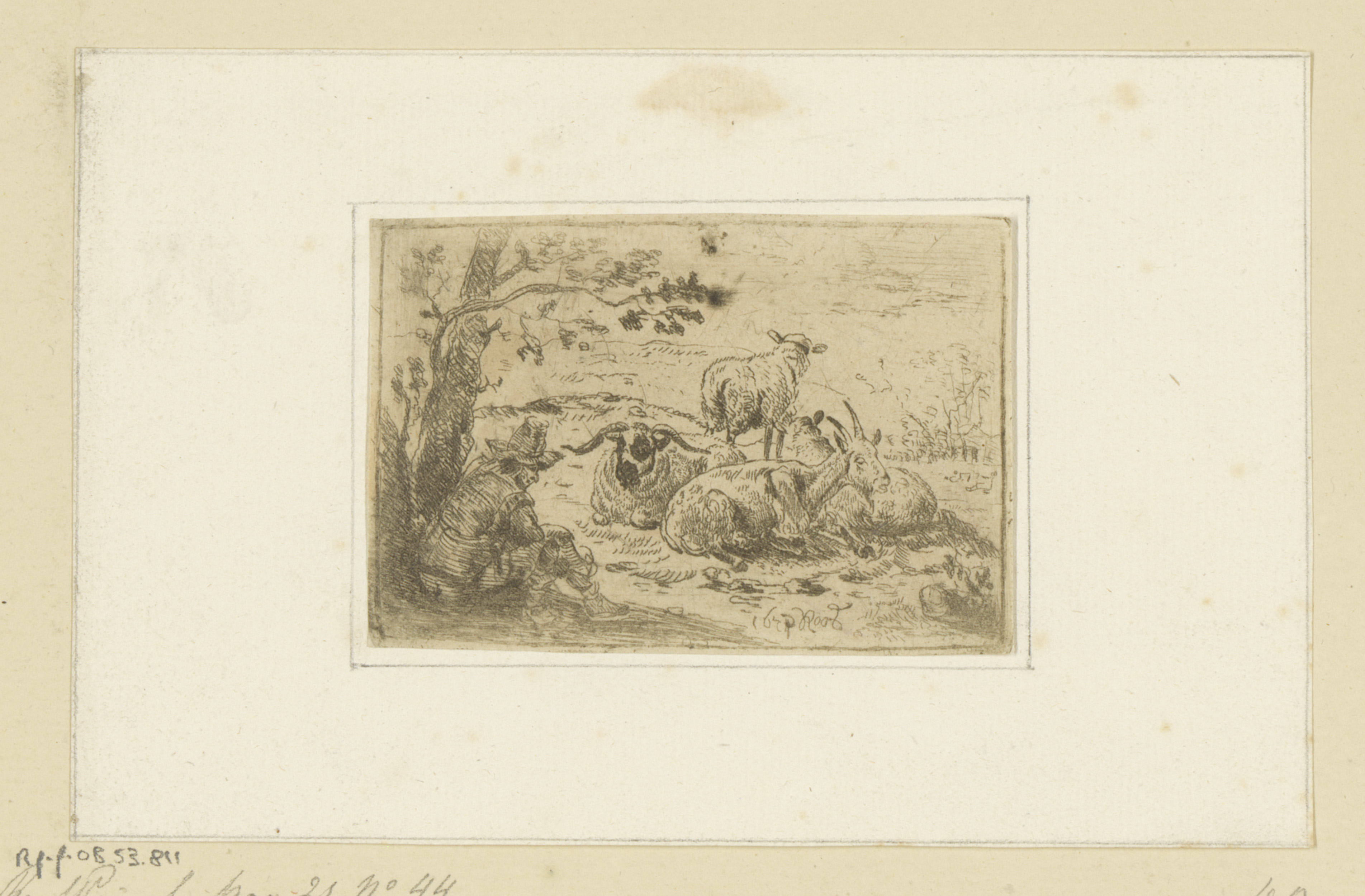 Herder onder boom gezeten bij geit, ram en twee schapen