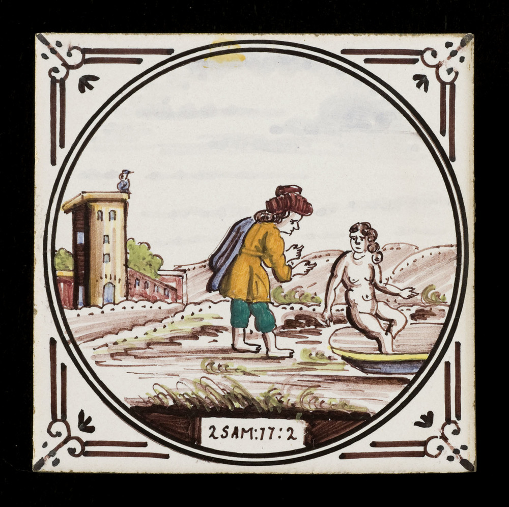 Tegel van keramiek met tinglazuur, voorstellende: Ba...